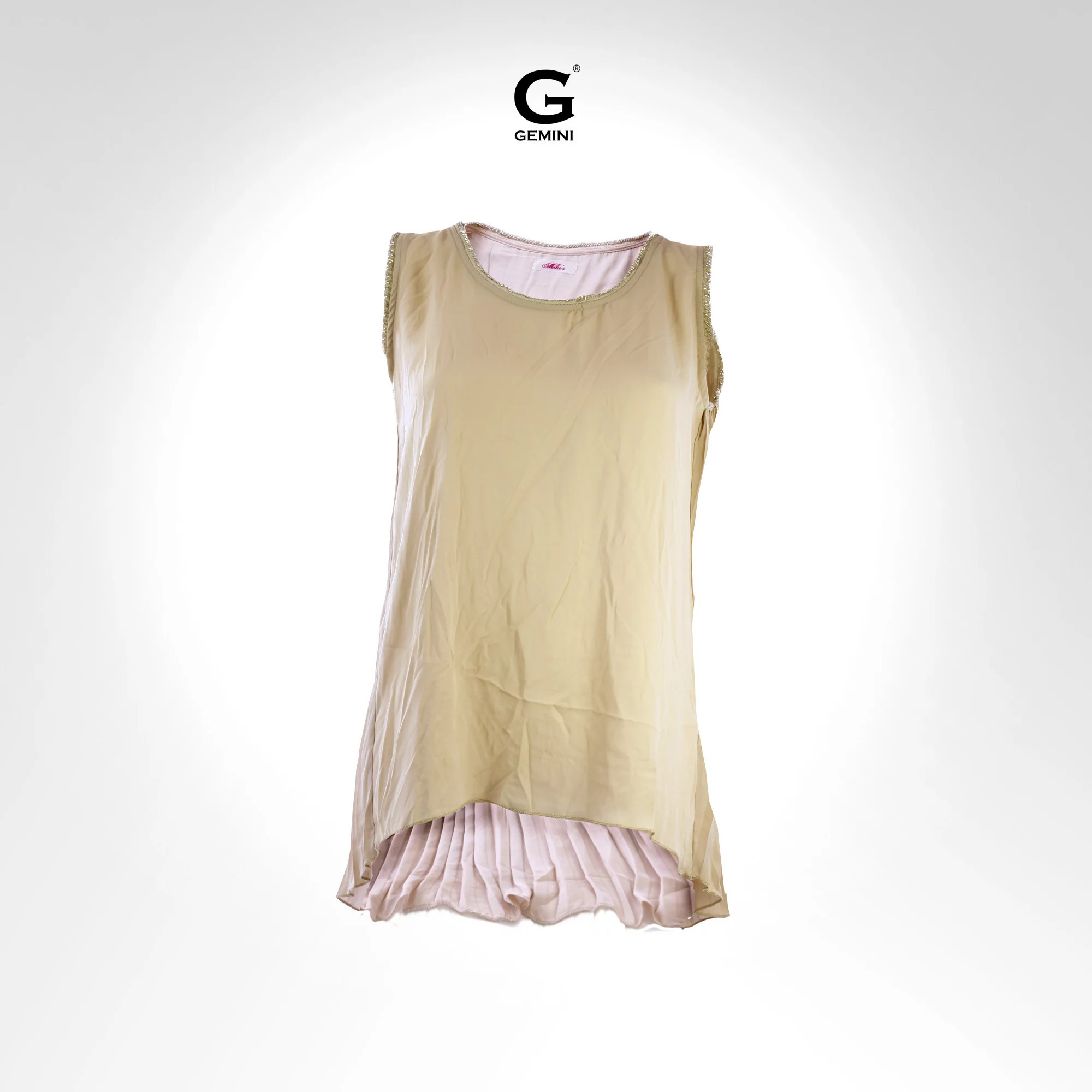Dámská letní halenka s širokými ramínky. Zadní díl delší plisovaný. Výstřih a ramínka zdobena parličkami. Materiál: 100% Polyestr.