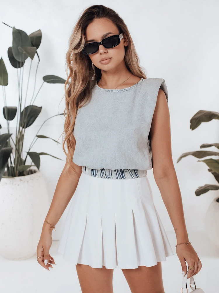 Jedinečná halenka KORSA, která každého zaujme, je vyrobena ze senzačního materiálu, má nápadný kratší střih a četné žebrované lemy. Tento model se bude skvěle hodit k džínám nebo šortkám na léto. Naprostý must have.