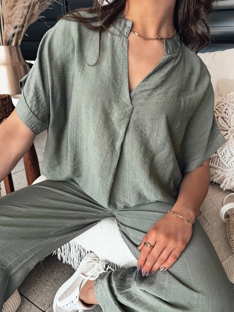 Zvolte si halenku NAMAYAS, která dodá vašemu šatníku nádech nonšalance. Smyslný výstřih do V decentně zvýrazňuje krk, zatímco krátké rukávy nabízejí lehkost a volnost. Tato halenka je klíčem k vytváření jedinečných sestav - dokonale se kombinuje s kalhotami NAMAYAS a vytváří harmonický celek.