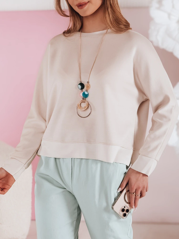Luźna bluzka oversize z długim rękawem, zakończona ściągaczami dla komfortowego dopasowania. Krótki fason świetnie komponuje się z wysokim stanem spodni i spódnic. Uniwersalny rozmiar pasuje od XS do L. W komplecie znajduje się wisiorek, który doskonale uzupełnia casualowe i eleganckie stylizacje. Modny, minimalistyczny design podkreśla nowoczesny charakter outfitu, idealna na różne okazji.