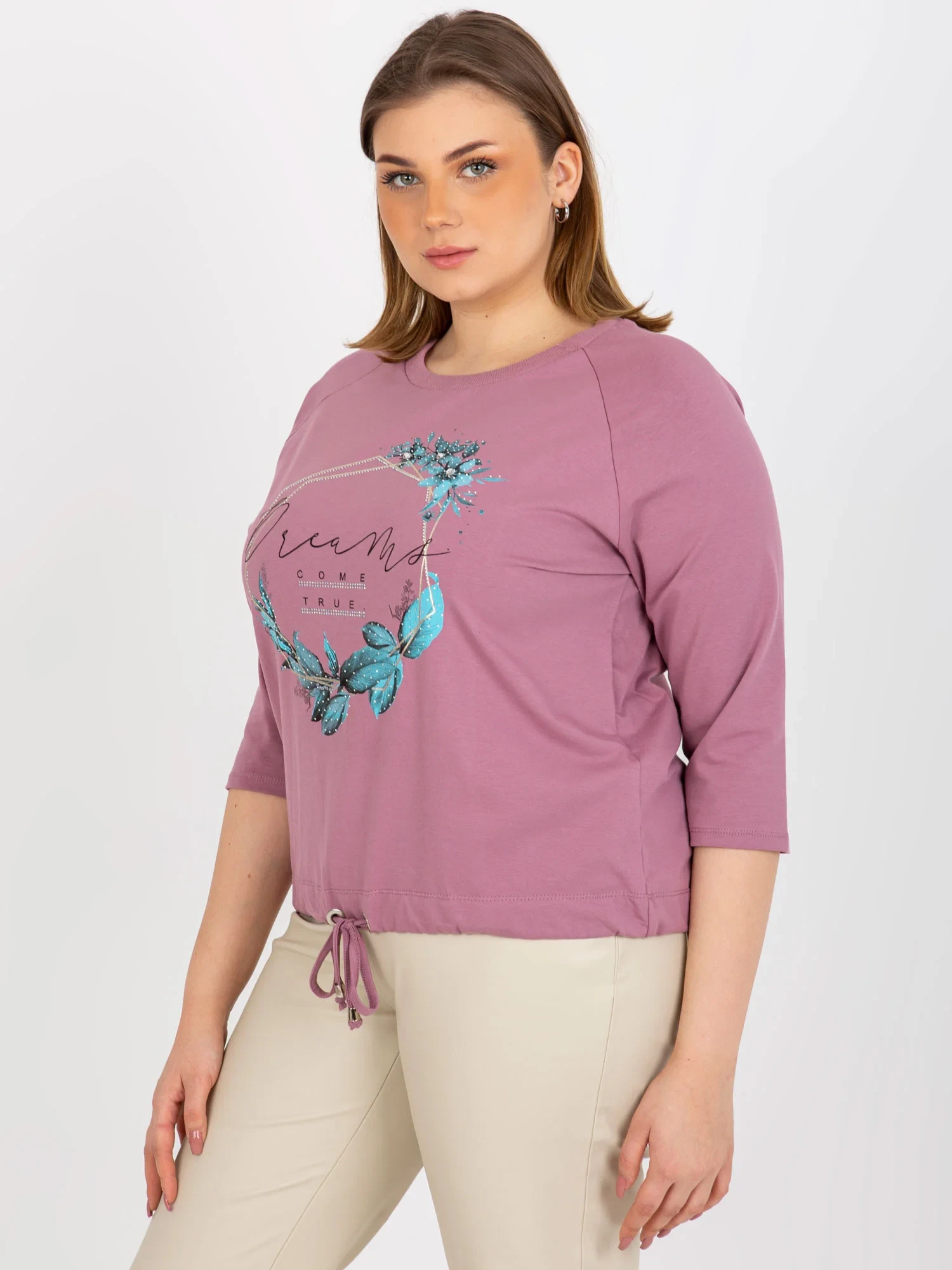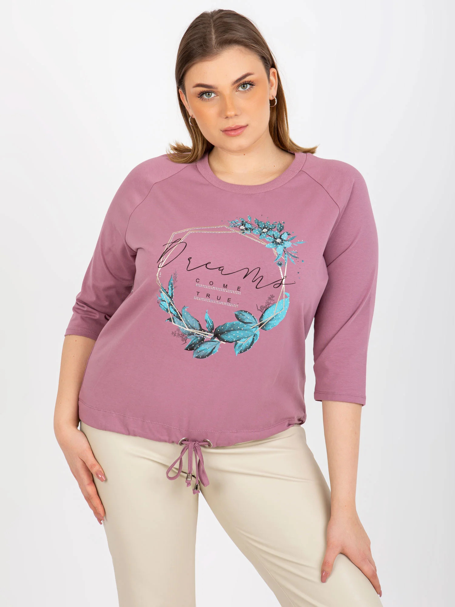 Rozměry halenky v jedné velikosti měřené na plocho: šířka v podpaží - 60 cm, délka rukávu - 42 cm, celková délka - 64 cm.