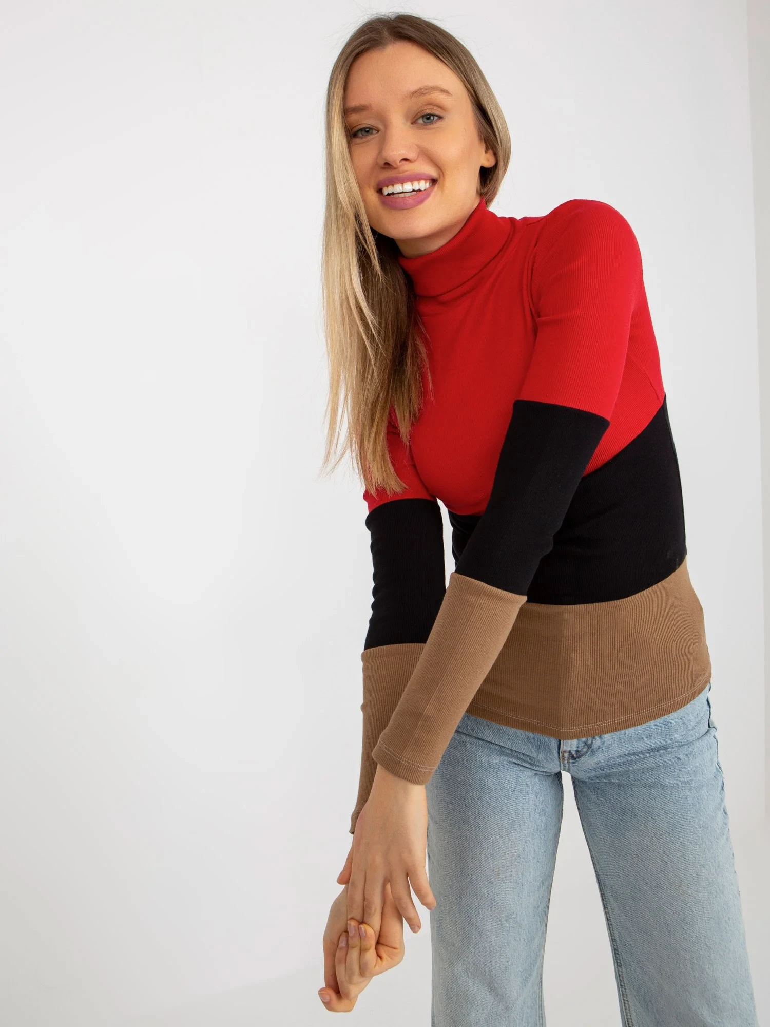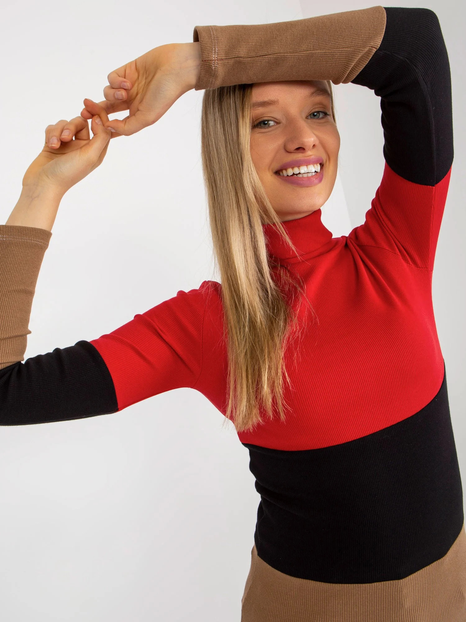 Červeno-temně-kamelová základní halenka s žebrovaným rolákem .