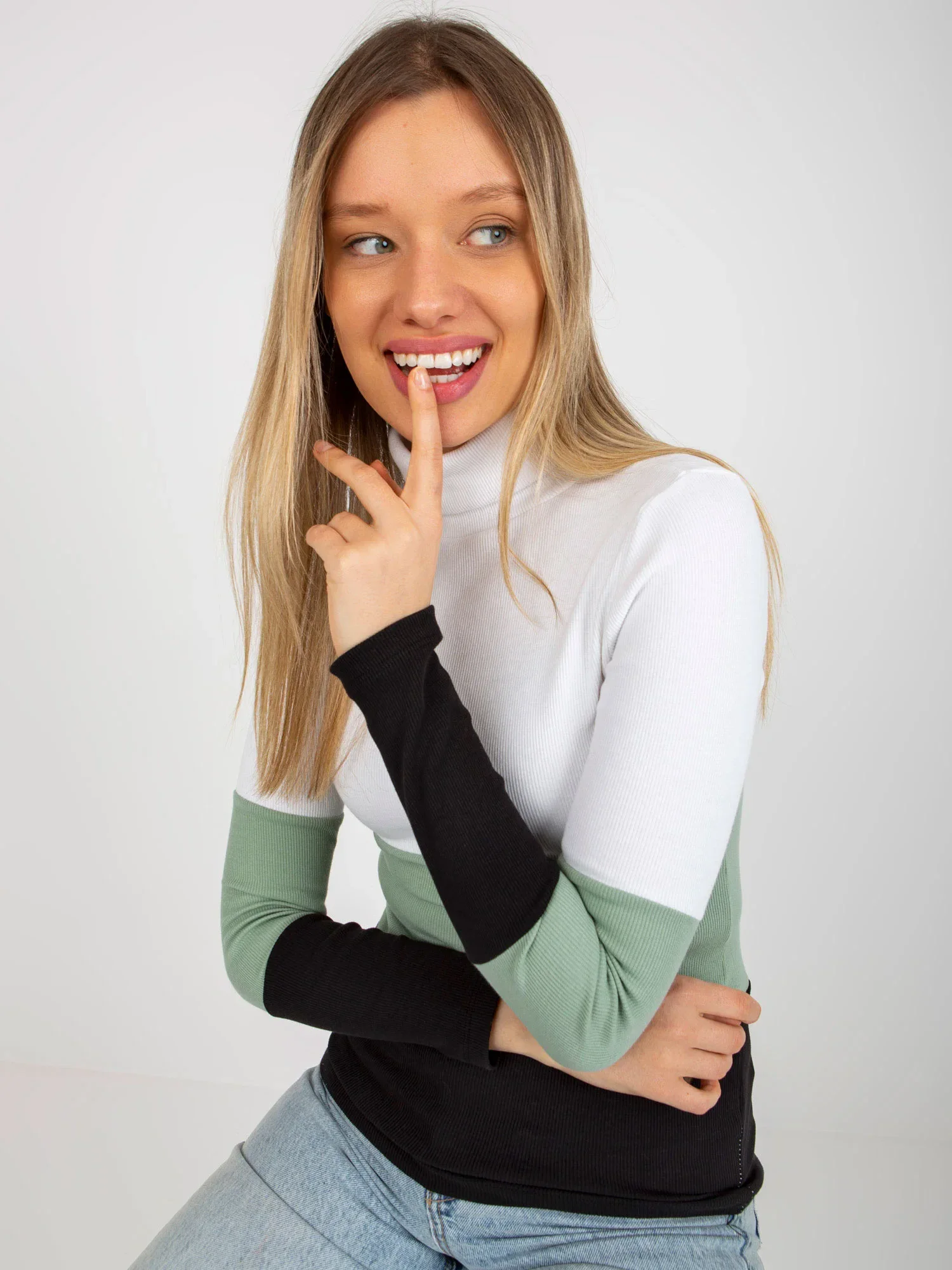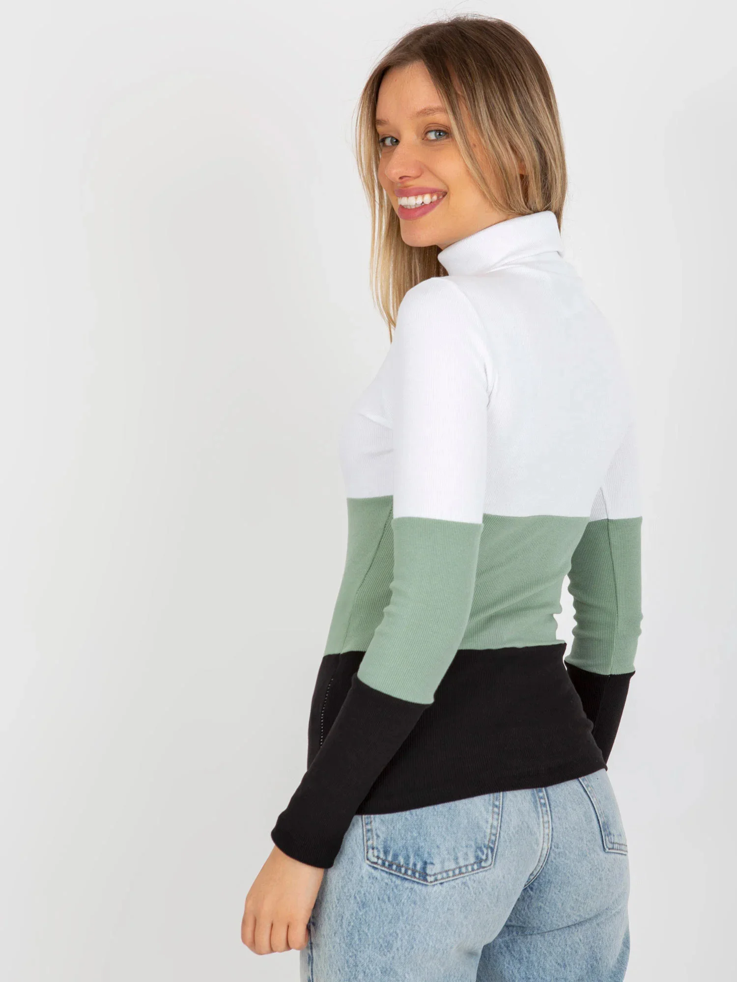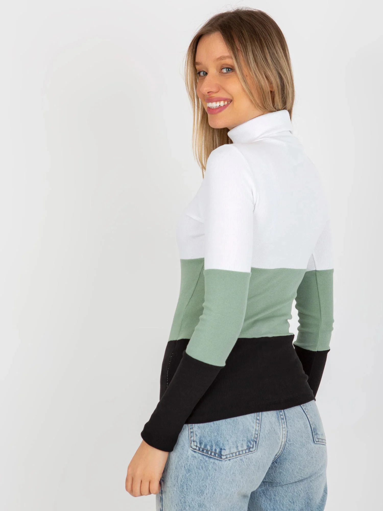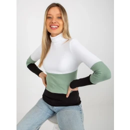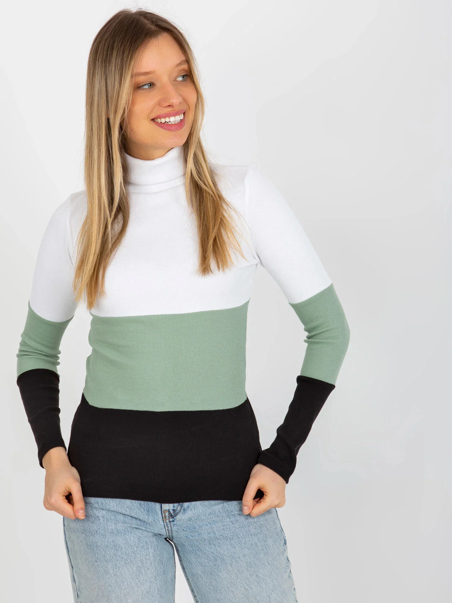 Dámská žebrovaná halenka s rolákem v barvě ecru-pistachio .