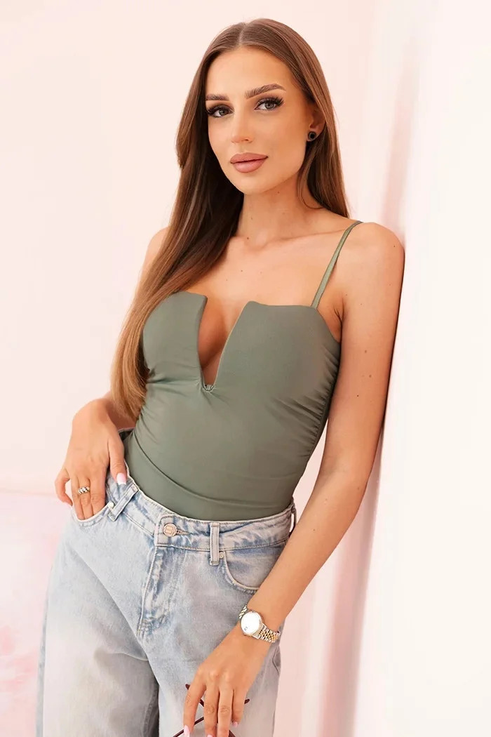 Stylové dámské body na ramínkách je ideální volbou pro ženy, které si cení elegance a pohodlí. Model se vyznačuje hlubokým výstřihem ve tvaru písmene V a jemným řasením, které mu dodává ženský šarm. Přiléhavý střih krásně zvýrazňuje postavu a elastický materiál zajišťuje pohodlí po celý den.
