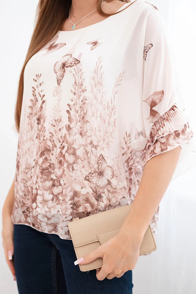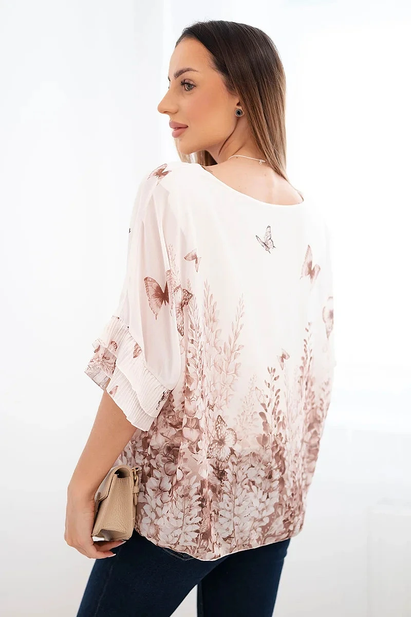 Dámská halenka s plisovaným rukávem je stylová a mimořádně pohodlná nabídka pro ženy, které ocení módní vzhled a komfort. Lehký, splývavý materiál zajišťuje, že halenka se krásně přizpůsobí postavě a poskytuje pohodlí po celý den. Originální vzor inspirovaný přírodou s motivem rostlin a motýlů dodává celku výjimečný charakter a decentní eleganci.
