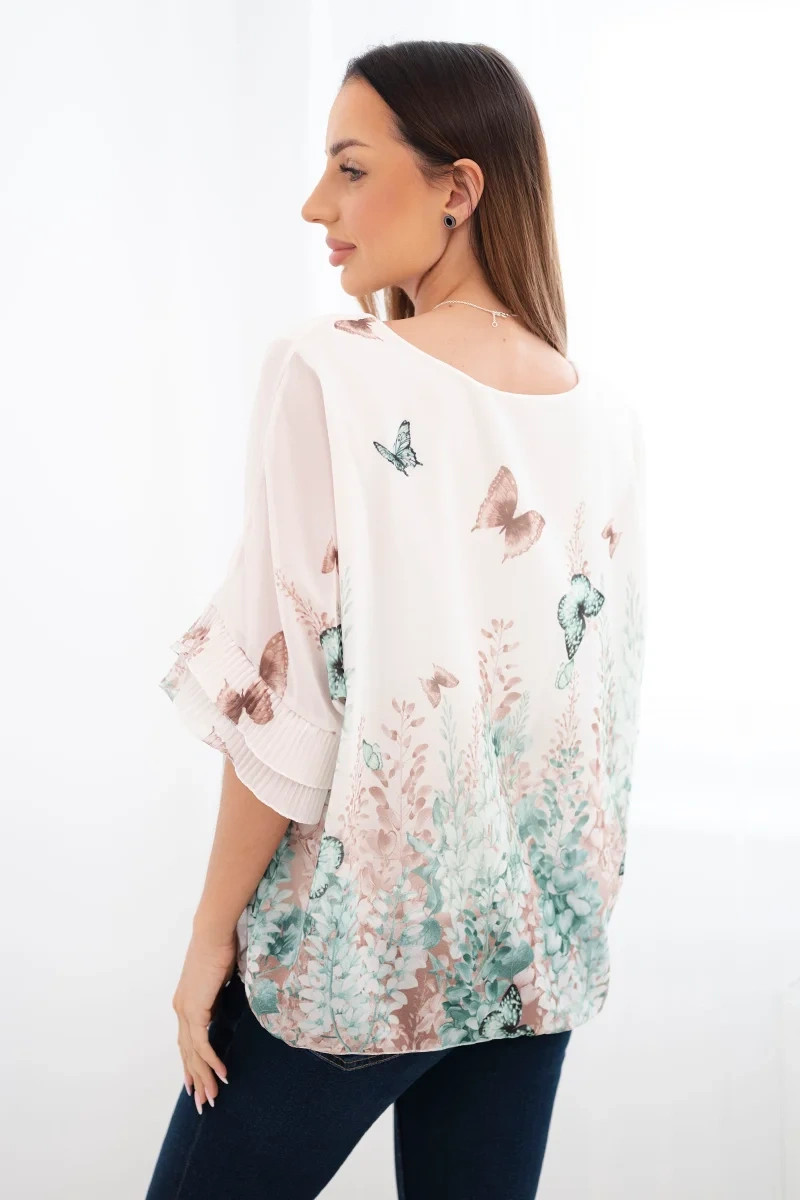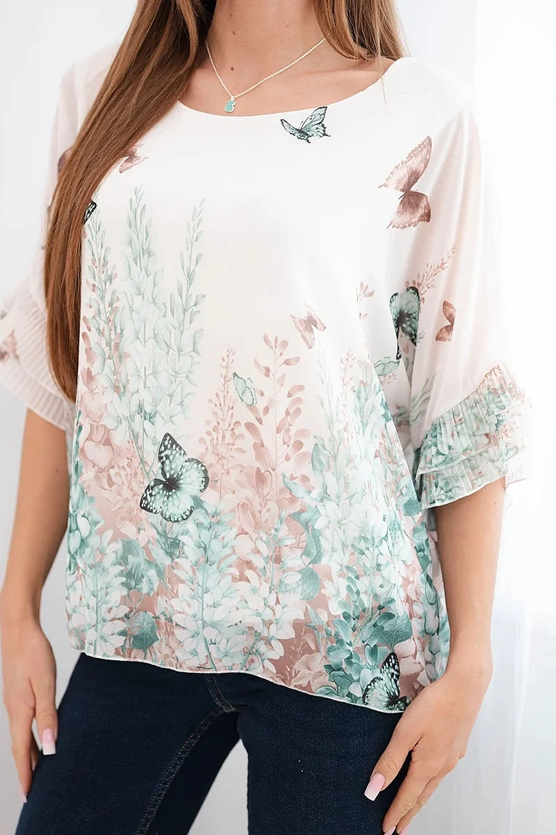 Dámská halenka s plisovaným rukávem je stylová a mimořádně pohodlná nabídka pro ženy, které ocení módní vzhled a komfort. Lehký, splývavý materiál zajišťuje, že halenka se krásně přizpůsobí postavě a poskytuje pohodlí po celý den. Originální vzor inspirovaný přírodou s motivem rostlin a motýlů dodává celku výjimečný charakter a decentní eleganci.