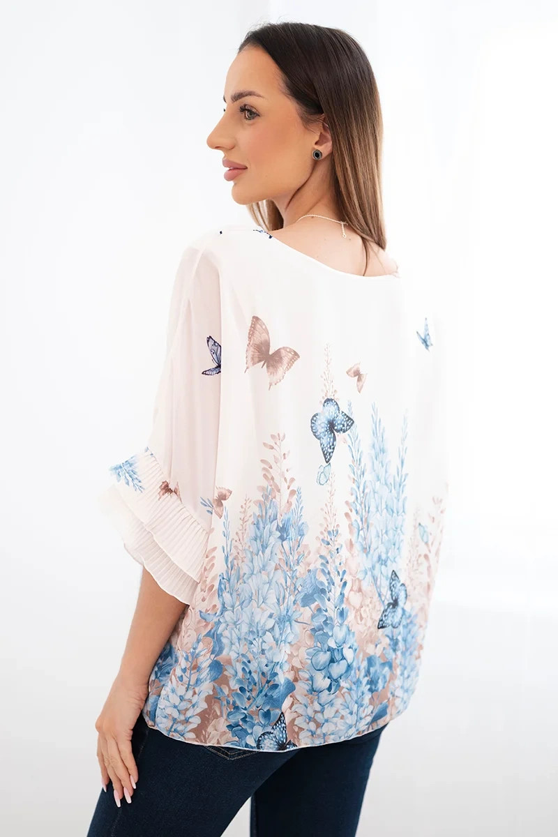 Dámská halenka s plisovaným rukávem je stylová a mimořádně pohodlná nabídka pro ženy, které ocení módní vzhled a komfort. Lehký, splývavý materiál zajišťuje, že halenka se krásně přizpůsobí postavě a poskytuje pohodlí po celý den. Originální vzor inspirovaný přírodou s motivem rostlin a motýlů dodává celku výjimečný charakter a decentní eleganci.
