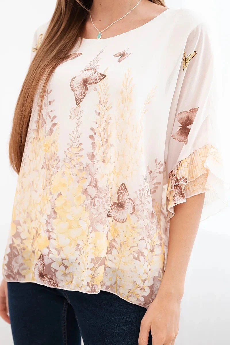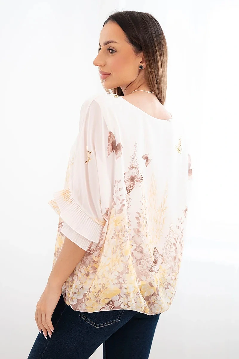 Dámská halenka s plisovaným rukávem je stylová a mimořádně pohodlná nabídka pro ženy, které ocení módní vzhled a komfort. Lehký, splývavý materiál zajišťuje, že halenka se krásně přizpůsobí postavě a poskytuje pohodlí po celý den. Originální vzor inspirovaný přírodou s motivem rostlin a motýlů dodává celku výjimečný charakter a decentní eleganci.