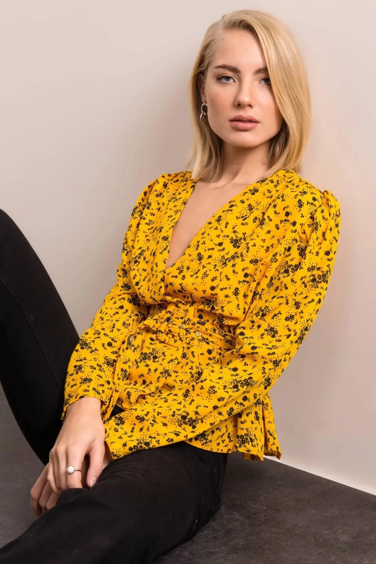 Model má na sobě velikost S.Rozměry modelu: výška 175 cm, poprsí 89 cm, pas 64 cm, boky 92 cm.