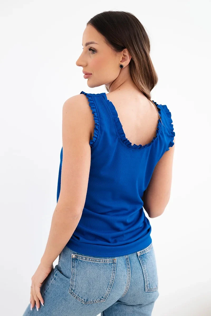 Stylová a mimořádně ženská dámská halenka bez rukávů je ideální volbou na teplejší dny. Vyrobena z příjemné viskózy s příměsí elastanu, skvěle se přizpůsobuje postavě a zajišťuje vysoký komfort nošení po celý den. Jemné volánky u výstřihu a ramen dodávají romantický nádech. Perfektní jak pro každodenní nošení, tak i elegantnější příležitosti – stačí ji zkombinovat s oblíbenou sukní nebo kalhotami.
