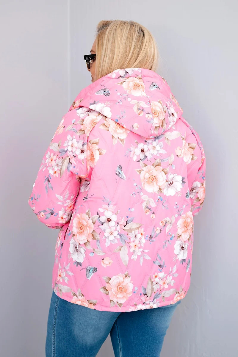 • Dámská jarní prošívaná bunda Plus Size s kapucí a květinovým vzorem světle růžová