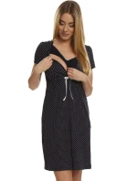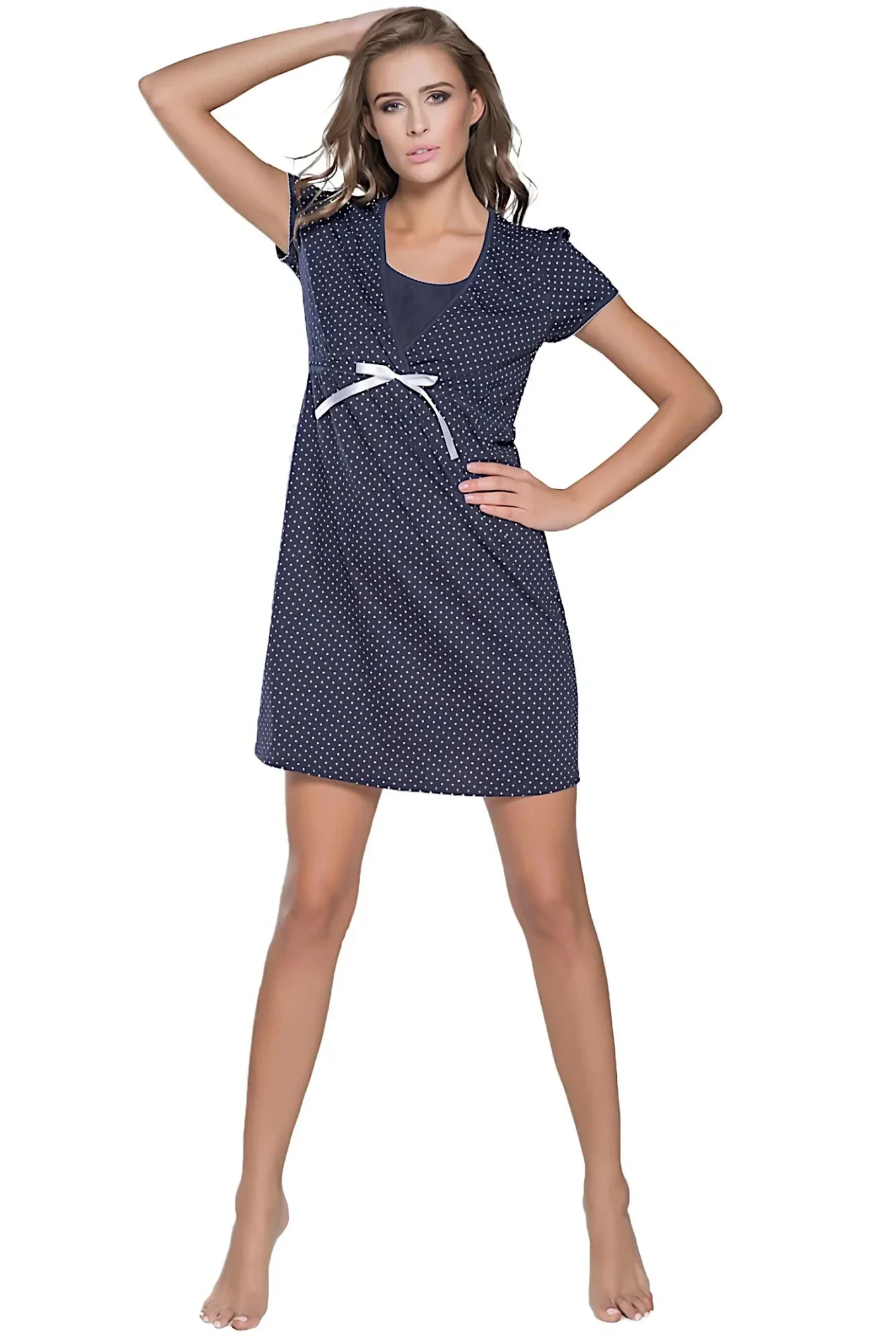 Dámská kojící košile Radosc Italian Fashion - tmavě modrá barva, puntíkatý vzor - střih je uzpůsobený snadnému odnímání látky kvůli kojení - krátký rukáv - délka nad kolena - pod prsy mašlička na ozdobu - příjemný materiál