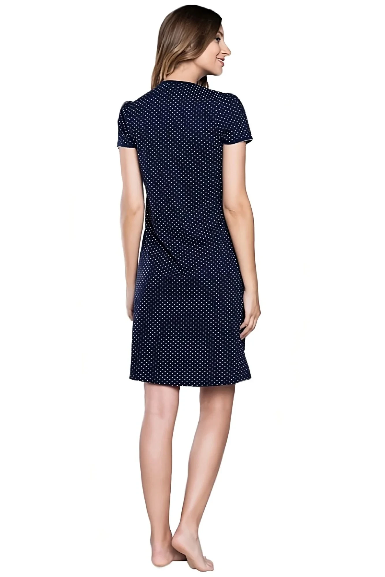 Dámská kojící košile Radosc Italian Fashion - tmavě modrá barva, puntíkatý vzor - střih je uzpůsobený snadnému odnímání látky kvůli kojení - krátký rukáv - délka nad kolena - pod prsy mašlička na ozdobu - příjemný materiálMateriálové složení: 100% bavlna