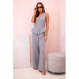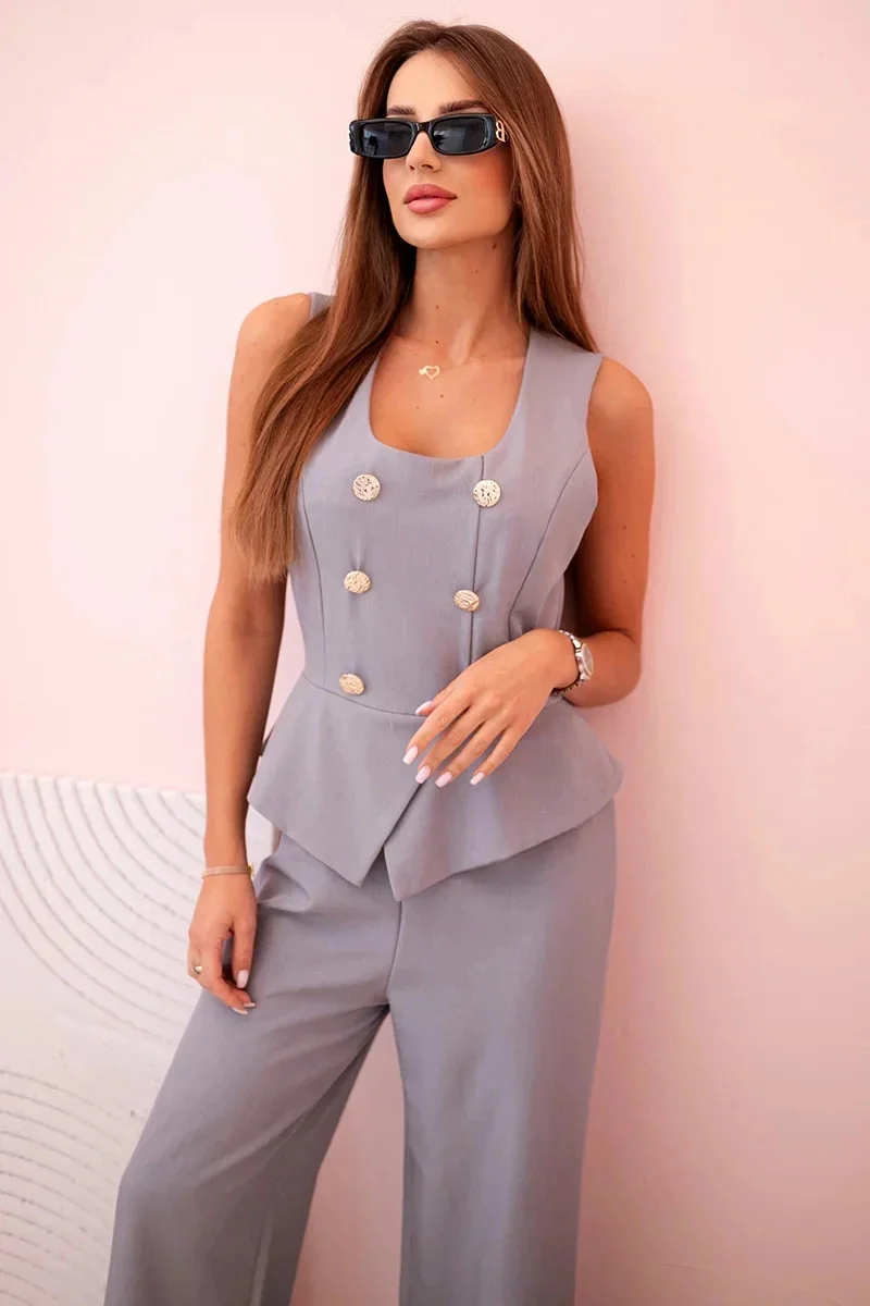 Dámská kombinéza bez rukávů s širokými nohavicemi a ozdobnými knoflíky šedý