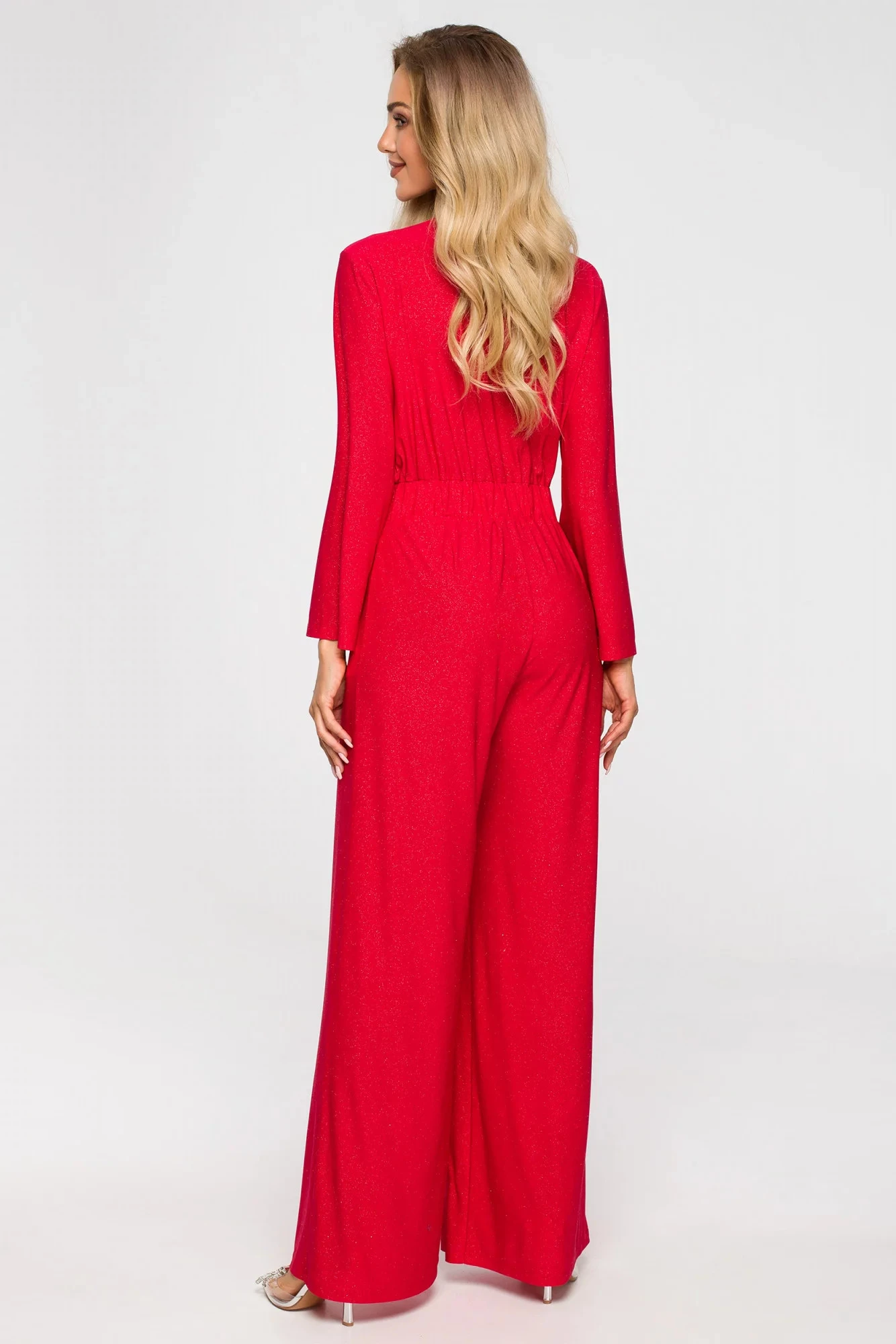 Tento krásný overal má řadu výhod. Je elegantní díky širokému střihu nohavic a rukávů, zavinovacímu vršku a jemnému řasení , je praktický a také pohodlný.