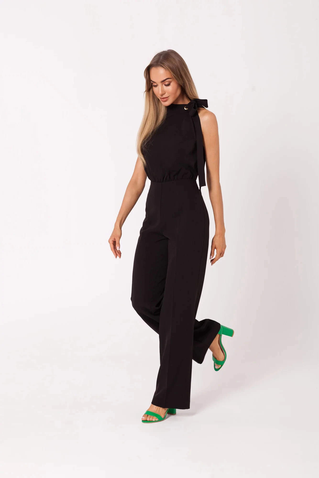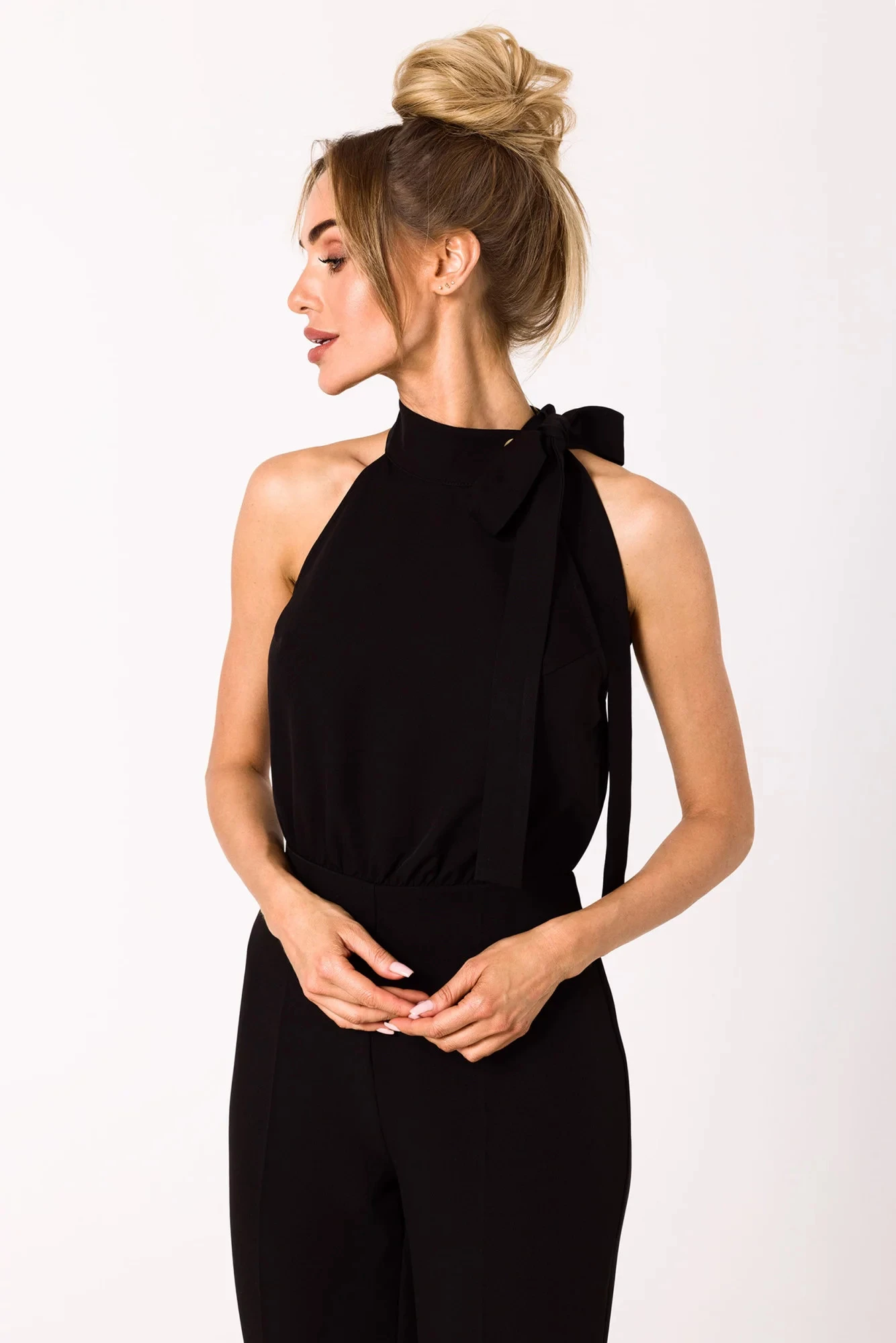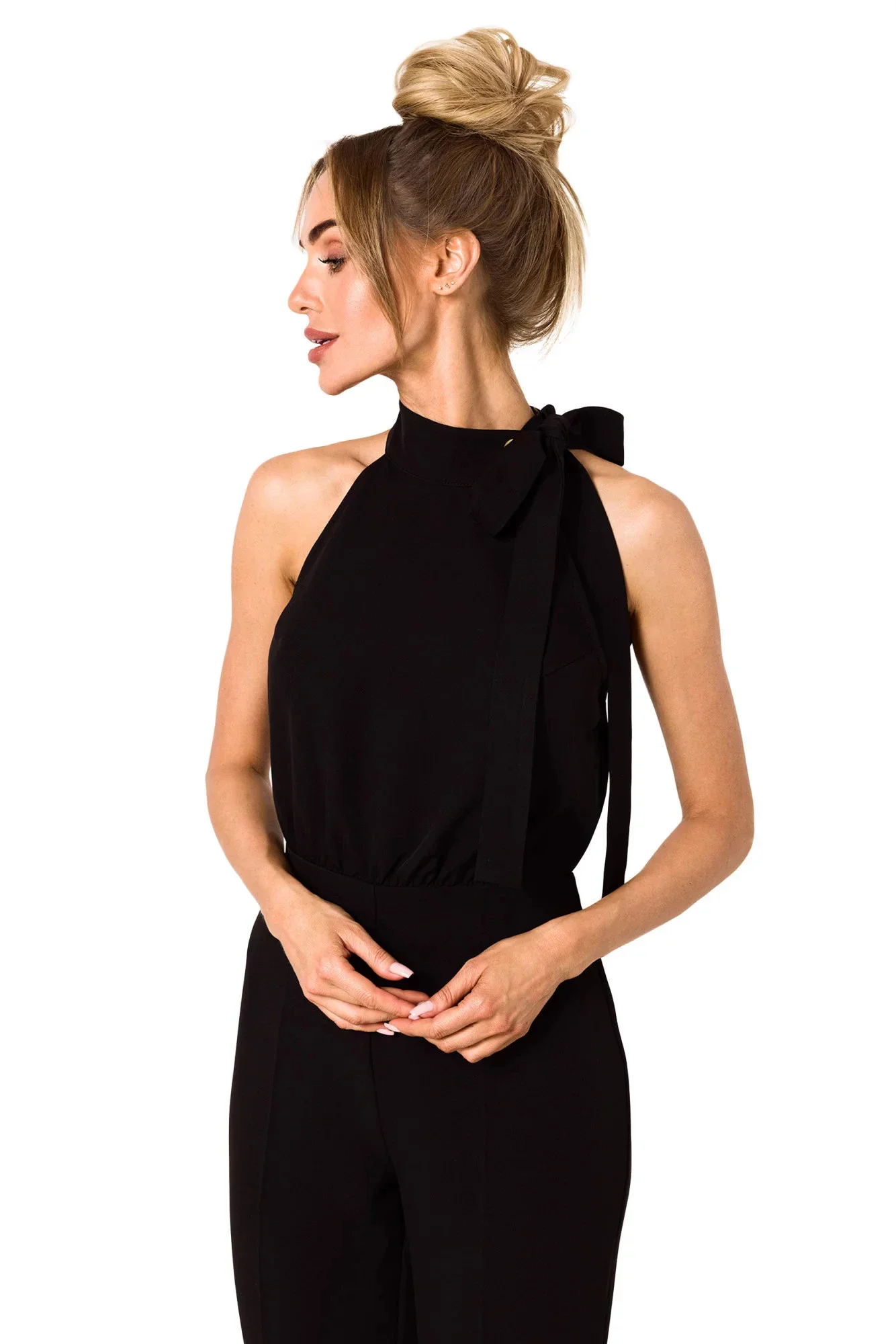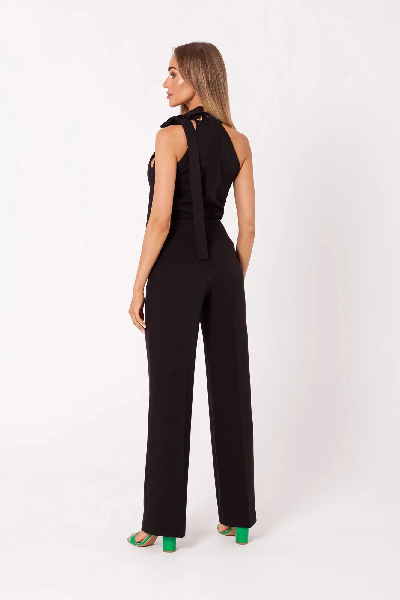 Tento lichotivý overal má výstřih na ramínka a detailní zavazování.