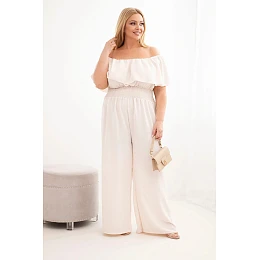 Dámská kombinéza Plus Size s bardot výstřihem, volánem a širokými nohavicemi béžový