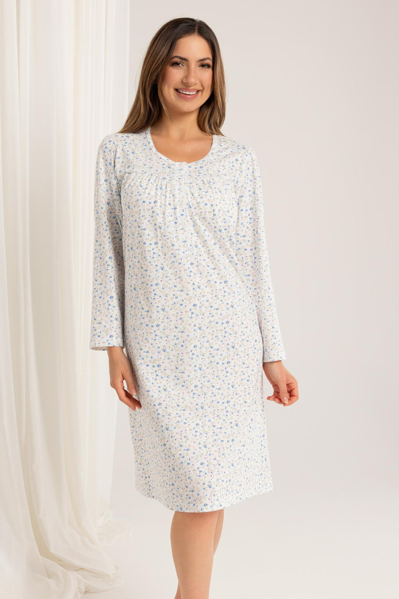 Koszula nocna 015 J/25 to elegancki i funkcjonalny model, uszyty z wysokiej jakości, wzorzystej bawełny. Miękki i oddychający materiał gwarantuje komfort noszenia, a klasyczny fason doskonale sprawdza się zarówno do spania, jak i relaksu w domowym zaciszu. Koszula posiada długi rękaw oraz delikatnie marszczony dekolt zapinany na guziczki – co czyni ją także praktyczną opcją dla mam karmiących. Długość za kolano zapewnia dodatkową wygodę i ochronę w chłodniejsze wieczory.
