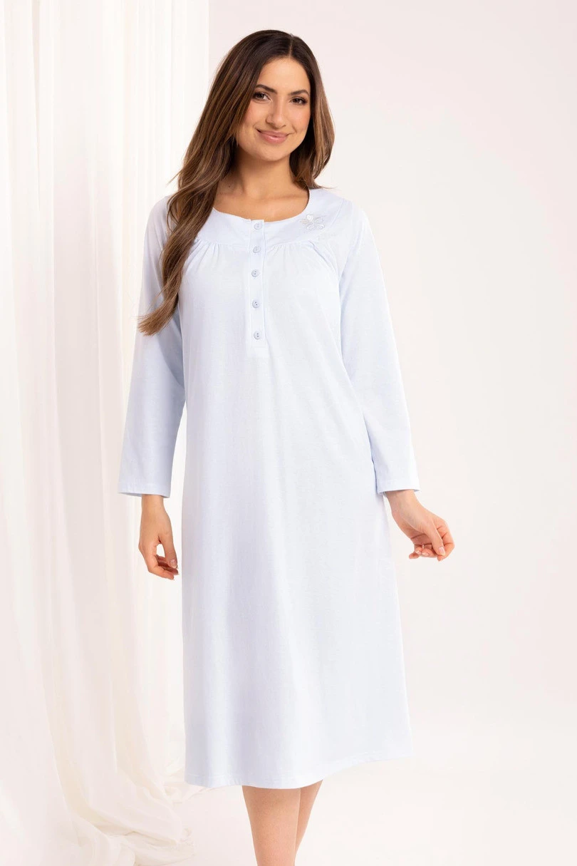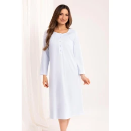 Dámská noční košile 016 J/25 je klasický model vytvořený s ohledem na pohodlí a funkčnost. Je vyrobena z vysoce kvalitní 100% bavlny pro naprostou prodyšnost a jemnost k pokožce, má dlouhé rukávy a sedlo s částečným rozepínáním na knoflíky pro snadné oblékání a decentní půvab. Lem košile je volný a ležérní, takže je vhodná jak na spaní, tak jako pohodlné domácí oblečení. Ideální také pro těhotné ženy nebo kojící matky.