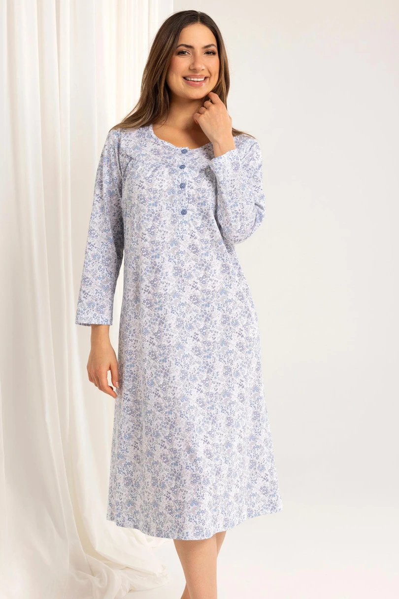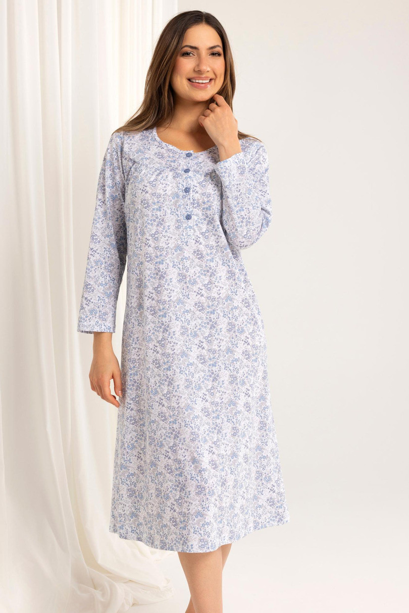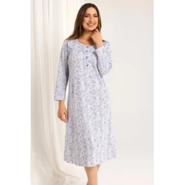 Dámská noční košile 017 BIG J/25 značky Regina je klasický model stvořený pro pohodlí a ženský styl. Je vyrobena ze 100% kvalitní bavlny s jemným vzorovaným povrchem a poskytuje prodyšnost a měkkost v každé fázi používání. Košile má délku ke kolenům, dlouhé rukávy a jemně nařasený výstřih na knoflíčky – ideální také pro kojící matky. Díky klasickému tvaru je košile vhodná nejen jako noční oděv, ale také jako pohodlné domácí oblečení. Je dokonalou kombinací elegance, funkčnosti a pohodlí.