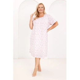 Pohodlná noční košile klasického volného střihu, ideální pro ženy, které si cení pohodlí a volnosti. Světlé barvy s jemným drobným květinovým motivem dodávají celku lehkost a nadčasovou eleganci. Díky krátkým rukávům a délce ke kolenům je košile ideální jak v létě, tak po celý rok. Jemné řasení pod prsy zajišťuje pohodlné nošení a neomezuje v pohybu, což zaručuje pohodlí během spánku i domácího odpočinku.