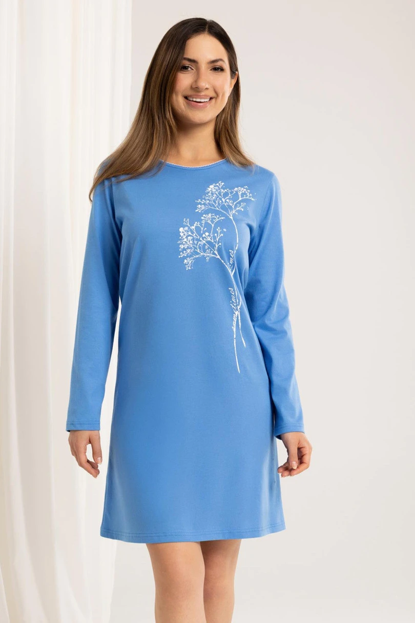 Koszula nocna 160 J/25 to klasyczna, bawełniana propozycja dla kobiet ceniących wygodę i prostotę. Wykonana z wysokiej jakości, 100% bawełny, jest przewiewna, miękka i przyjazna dla skóry, co sprawia, że idealnie sprawdza się podczas snu. Model posiada długi rękaw, półokrągły dekolt oraz delikatny nadruk z przodu, który nadaje koszuli lekkości i kobiecego uroku. Długość przed kolano i luźny krój zapewniają swobodę ruchów i wygodę noszenia przez cały rok.