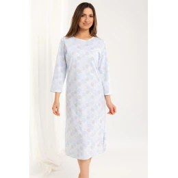 Koszula nocna 161 J/25 to idealna propozycja dla kobiet, które szukają wygody, naturalnych materiałów i delikatnego wzornictwa. Uszyta z wysokogatunkowej, 100% bawełny w urocze kropki, zapewnia pełen komfort użytkowania i oddychalność przez całą noc. Model posiada rękaw 7/8, okrągły dekolt oraz długość sięgającą za kolana – doskonały wybór na każdą porę roku. Klasyczny krój i delikatny wzór sprawiają, że koszula sprawdzi się zarówno jako bielizna nocna, jak i lekka odzież domowa.