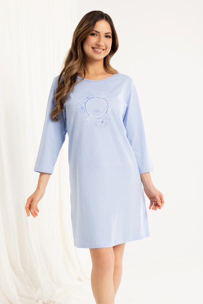 Koszula damska 163 BIG J/25 to klasyczny i komfortowy model wykonany z wysokiej jakości, 100% bawełny. Miękka i przewiewna tkanina zapewnia doskonały komfort snu oraz pełną swobodę ruchów. Koszula posiada rękaw o długości 3/4, półokrągły dekolt i delikatny nadruk z przodu, który dodaje jej kobiecego uroku. Długość przed kolano sprawia, że model idealnie sprawdzi się przez cały rok – zarówno latem, jak i w chłodniejsze wieczory.