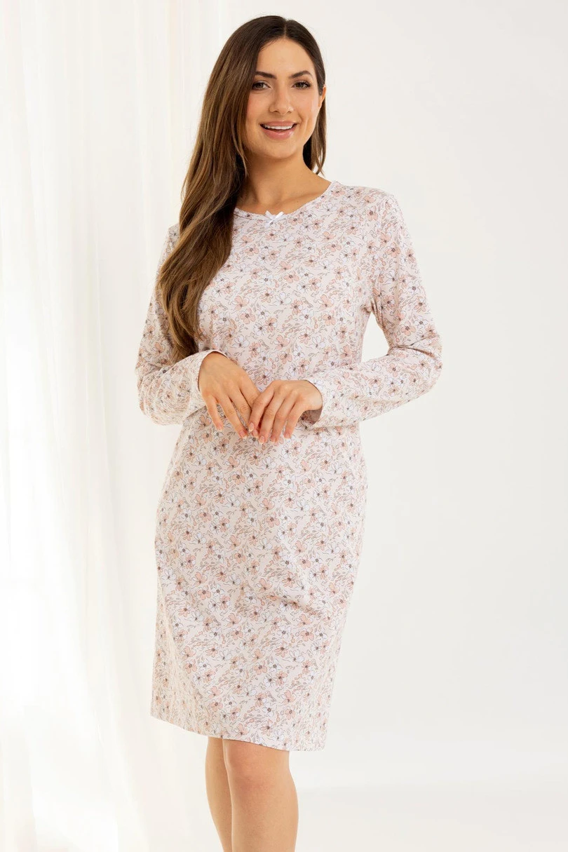 Koszula nocna 164 J/25 to wyjątkowa propozycja dla kobiet ceniących subtelny, kobiecy styl i naturalne tkaniny. Wykonana z wysokiej jakości bawełny, ozdobiona drobnym, kwiatowym wzorem, zachwyca lekkością i romantycznym wykończeniem. Koszula posiada długi rękaw oraz okrągły dekolt ozdobiony kokardką i dekoracyjnym obszyciem, co dodaje jej uroku. Długość do kolana i luźny fason zapewniają komfort noszenia przez cały rok – idealna zarówno do snu, jak i wieczornego relaksu.