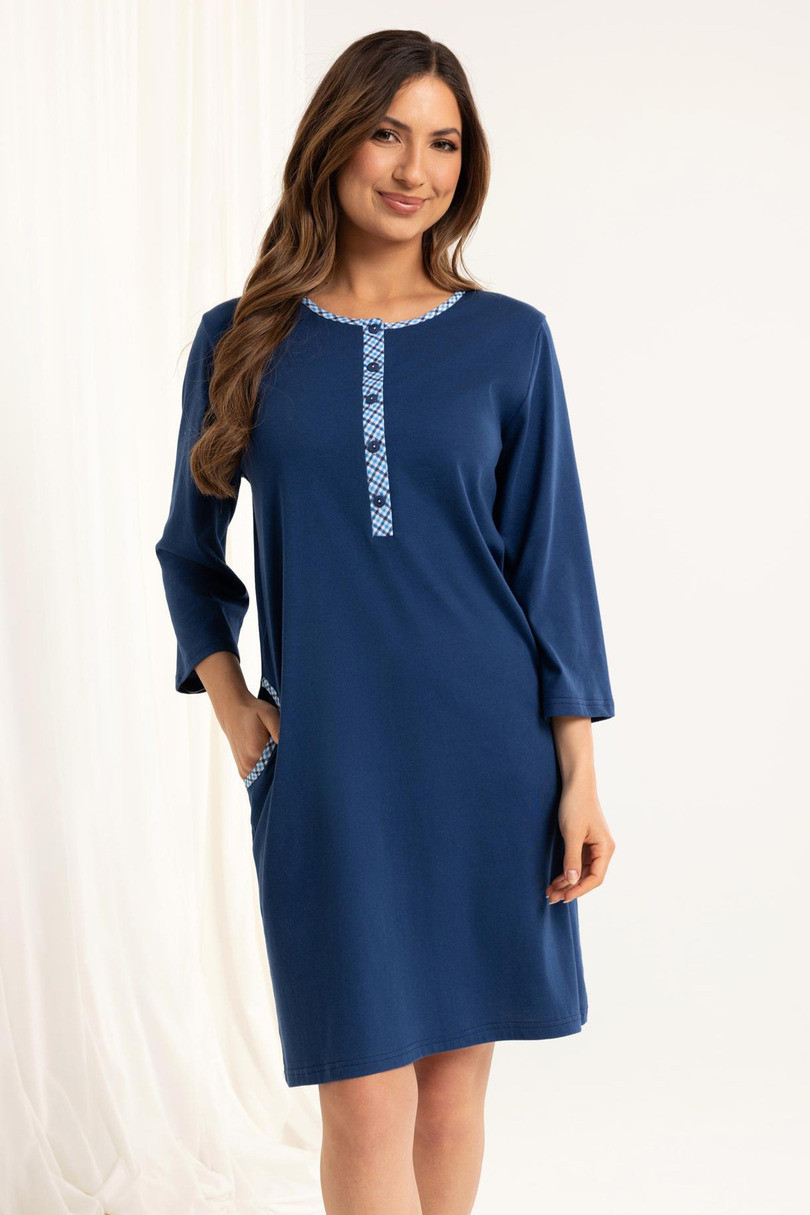 Koszula nocna 165 BIG J/25 to funkcjonalna i stylowa propozycja dla kobiet, które cenią komfort i swobodę ruchów. Wykonana z wysokiej jakości, 100% bawełny, jest przewiewna, miękka i przyjazna dla skóry. Model posiada rękaw 7/8, rozpinany półokrągły dekolt oraz praktyczne kieszenie na biodrach, co zwiększa jej funkcjonalność – doskonała również dla mam karmiących. Długość przed kolano i luźny krój sprawiają, że koszula idealnie nadaje się na każdą porę roku.