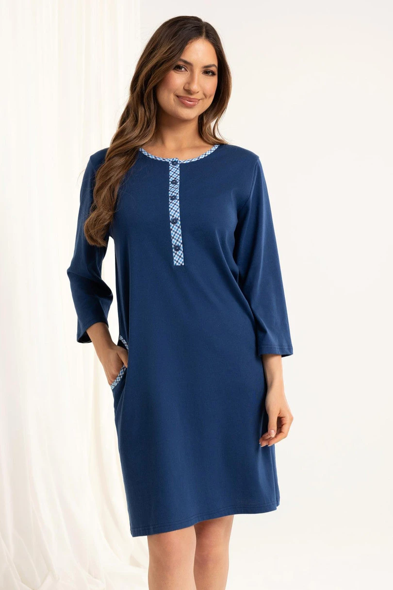 Koszula nocna 165 J/25 to funkcjonalna i stylowa propozycja dla kobiet, które cenią komfort i swobodę ruchów. Wykonana z wysokiej jakości, 100% bawełny, jest przewiewna, miękka i przyjazna dla skóry. Model posiada rękaw 7/8, rozpinany półokrągły dekolt oraz praktyczne kieszenie na biodrach, co zwiększa jej funkcjonalność – doskonała również dla mam karmiących. Długość przed kolano i luźny krój sprawiają, że koszula idealnie nadaje się na każdą porę roku.