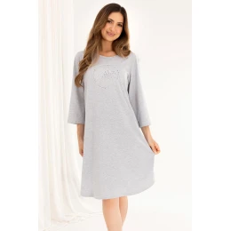 Koszula nocna 167 BIG J/25 to idealne połączenie klasycznego fasonu i subtelnego uroku. Wykonana w 100% z wysokiej jakości bawełny, gwarantuje komfort noszenia oraz przewiewność przez całą noc. Model posiada rękaw 3/4 i półokrągły dekolt, a przód ozdobiony został delikatnym nadrukiem. Lekko rozkloszowany krój ku dołowi pięknie układa się na sylwetce, zapewniając swobodę ruchów. Długość przed kolano sprawia, że koszula jest praktyczna zarówno na cieplejsze, jak i chłodniejsze noce.
