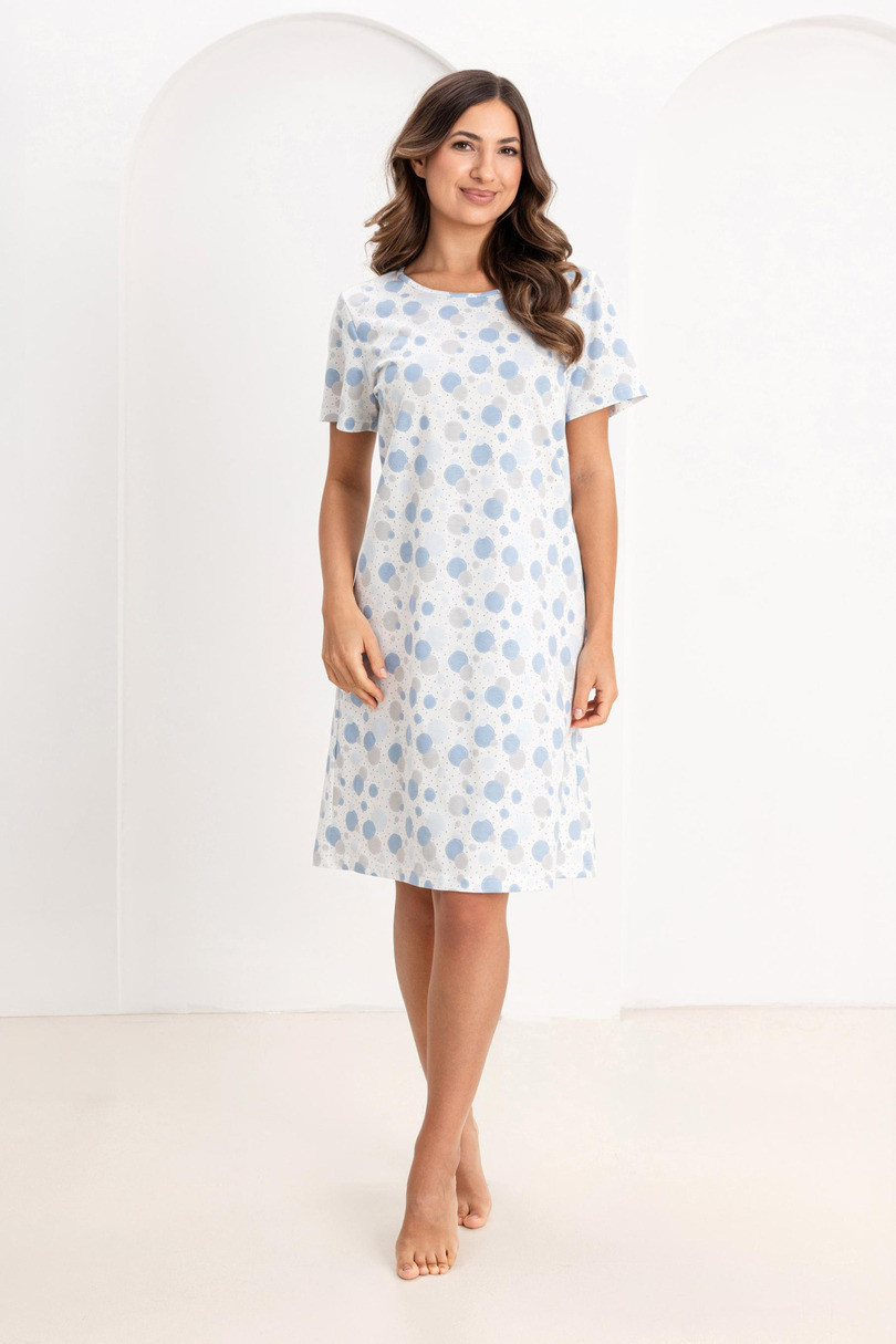 Dámská noční košile s jednoduchým, nadčasovým střihem, který zajišťuje vysoký komfort nošení. Světlé barvy a jemný, drobný vzor jí dodávají lehký a ženský charakter. Krátký rukáv a délka ke kolenům předurčují tento model k celoročnímu nošení. Volný střih neomezuje v pohybu, takže je tato košile ideální volbou pro spánek i domácí relaxaci.