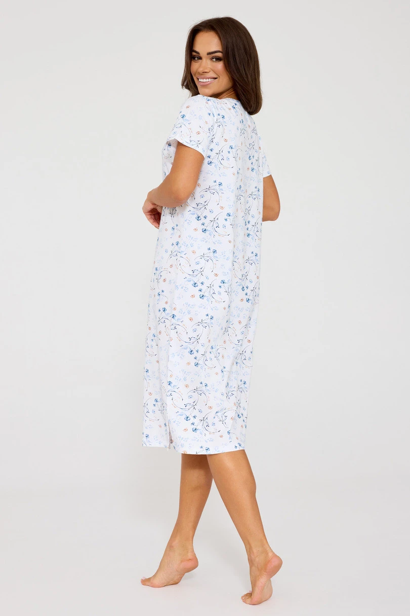 Koszula posiada krótki rękaw oraz długość do kolan, co zapewnia komfort noszenia nawet w cieplejsze noce. Subtelny, kwiatowy wzór nadaje całości romantycznego i lekkiego charakteru. Dodatkowym atutem są rozporki po bokach, które zwiększają swobodę ruchów i podkreślają kobiecy fason.