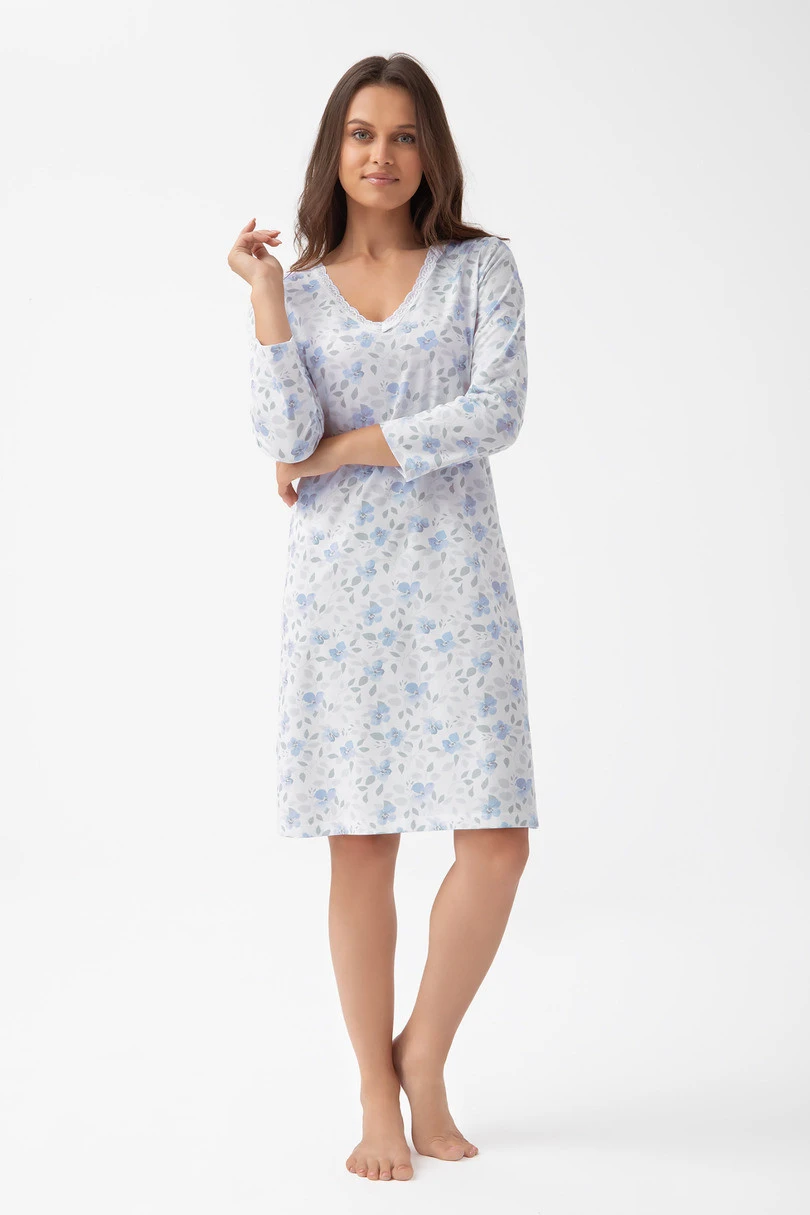 Noční košile 261 J/25 je ženský model vytvořený pro pohodlí a jemnou eleganci. Je vyrobena z měkké, prodyšné bavlny a zdobí ji vzor květin a listů na klasickém bílém pozadí. 7/8 rukávy a špičatý výstřih zakončený jemnou krajkou podtrhují romantický charakter košile. Díky délce ke kolenům je tento model ideální po celý rok - v létě i v zimě.