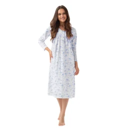 Dámská noční košile Luna 338 J/25 je esencí ženského stylu a pohodlí. Květinový vzor a volný střih zaručují volnost pohybu a příjemné nošení. Měkký výstřih do V s mírným zaoblením a sedlo s řasením dodávají košili jemný půvab. Díky zapínání na čtyři knoflíky se snadno obléká a díky délce ke kolenům je košile ideální pro každé roční období. Je vyrobena z nejkvalitnější 100% bavlny, která zaručuje pohodlný spánek a přirozenou prodyšnost.