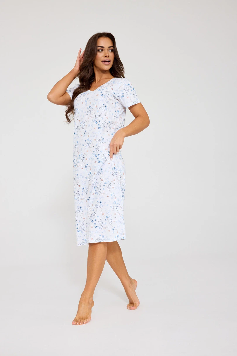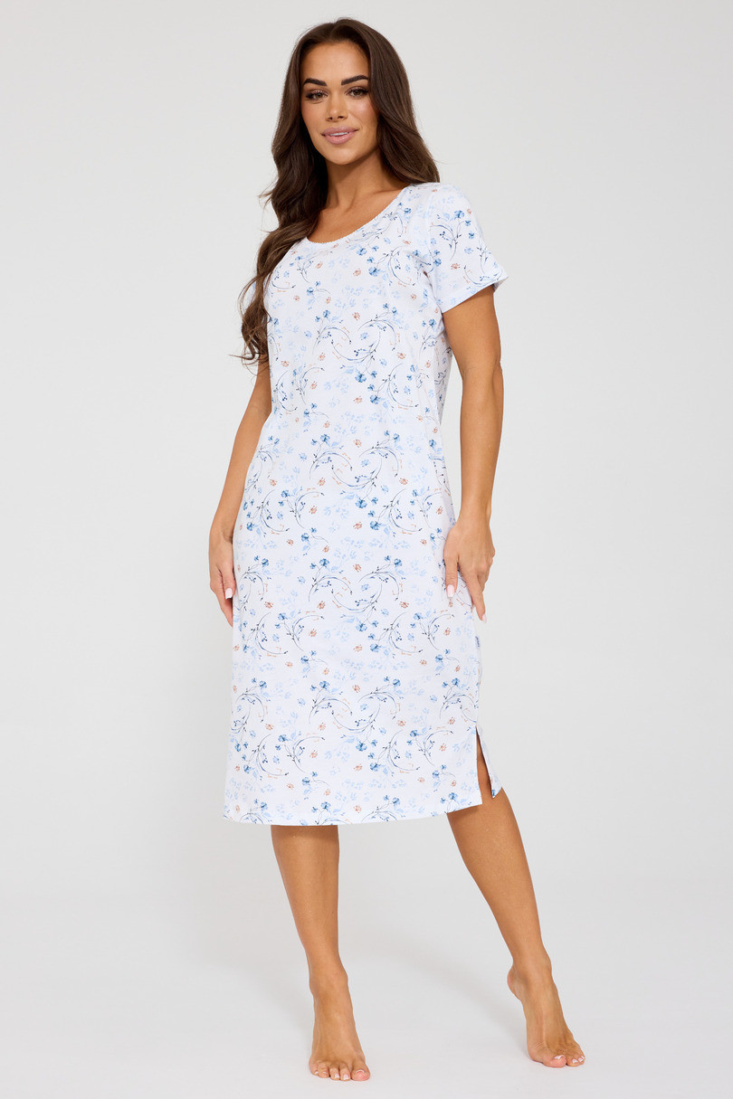 Koszula posiada krótki rękaw oraz długość do kolan, co zapewnia komfort noszenia nawet w cieplejsze noce. Subtelny, kwiatowy wzór nadaje całości romantycznego i lekkiego charakteru. Dodatkowym atutem są rozporki po bokach, które zwiększają swobodę ruchów i podkreślają kobiecy fason.