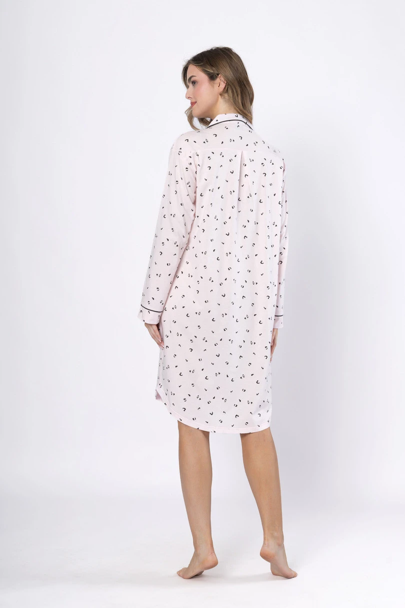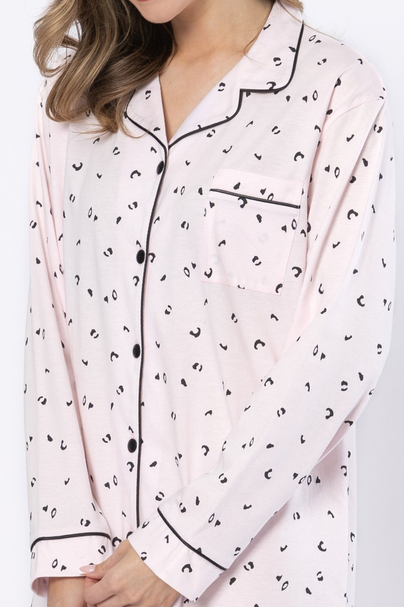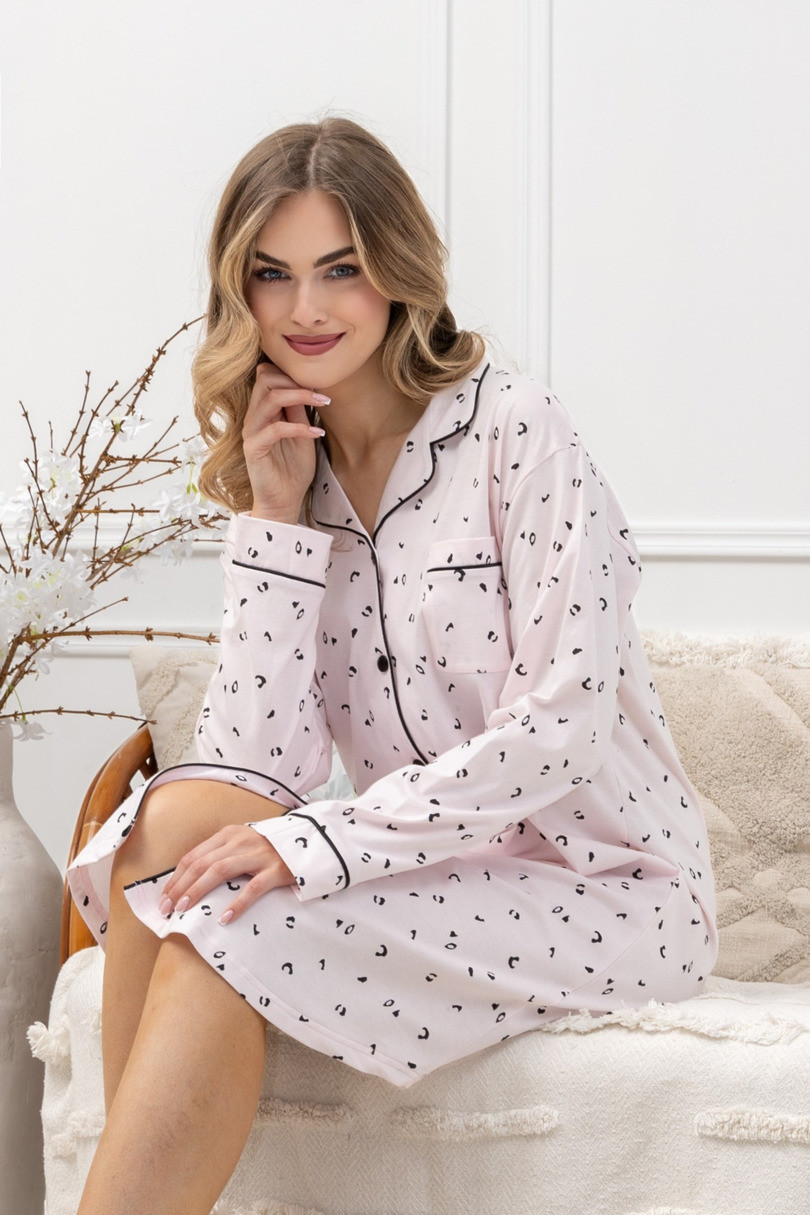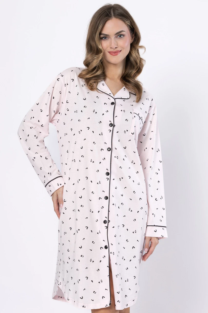 ANGELA 1619 marki Leveza to elegancka i wygodna koszula nocna damska rozpinana, wykonana z wysokiej jakości 100% bawełny, która zapewnia naturalną przewiewność i komfort snu. Model o długości do kolan został zaprojektowany z myślą o funkcjonalności i kobiecym stylu. Koszula posiada klasyczny kołnierz, długi rękaw z mankietem oraz subtelne atłasowe wypustki, które dodają całości elegancji. Delikatny wzór w drobne panterki na jasnoróżowym tle tworzy stylowy, a jednocześnie subtelny efekt. Dodatkowym atutem jest EAN čárové kódy zboží jsou:
