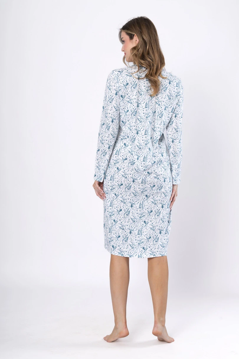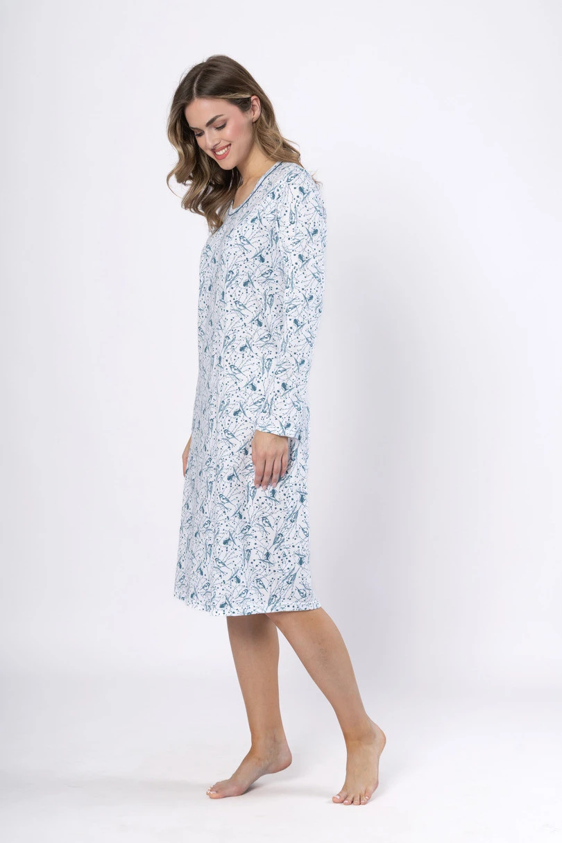 Koszula nocna BETI 1641 marki Leveza to idealne połączenie wygody i delikatnego, kobiecego stylu. Wykonana w 100% z wysokogatunkowej bawełny, gwarantuje naturalną przewiewność i komfort noszenia przez całą noc. Model z długim rękawem i klasycznym, okrągłym dekoltem został subtelnie ozdobiony kontrastowymi wypustkami, które nadają mu lekko elegancki charakter. Dominujące kolory – biały i morski – w połączeniu z uroczym wzorem ptaszków tworzą harmonijną i relaksującą kompozycję. Koszula ma długość za kolano, co zapewnia wygodę oraz ciepło, szczególnie w chłodniejsze dni. Dostępna w rozmiarach M–2XL.