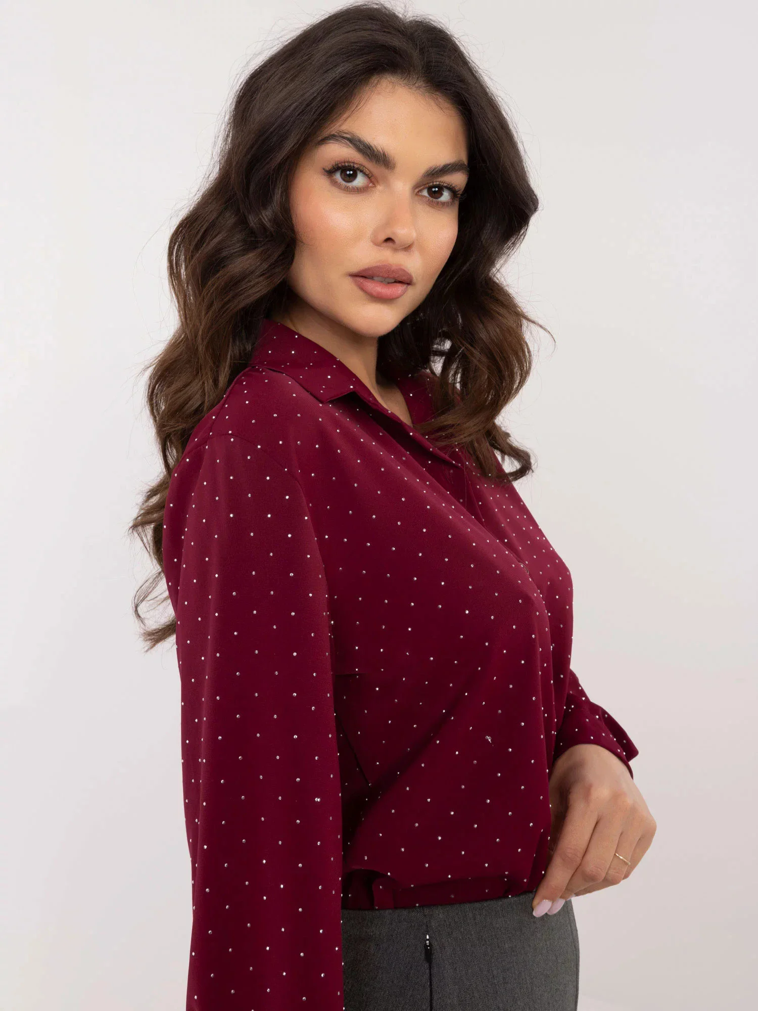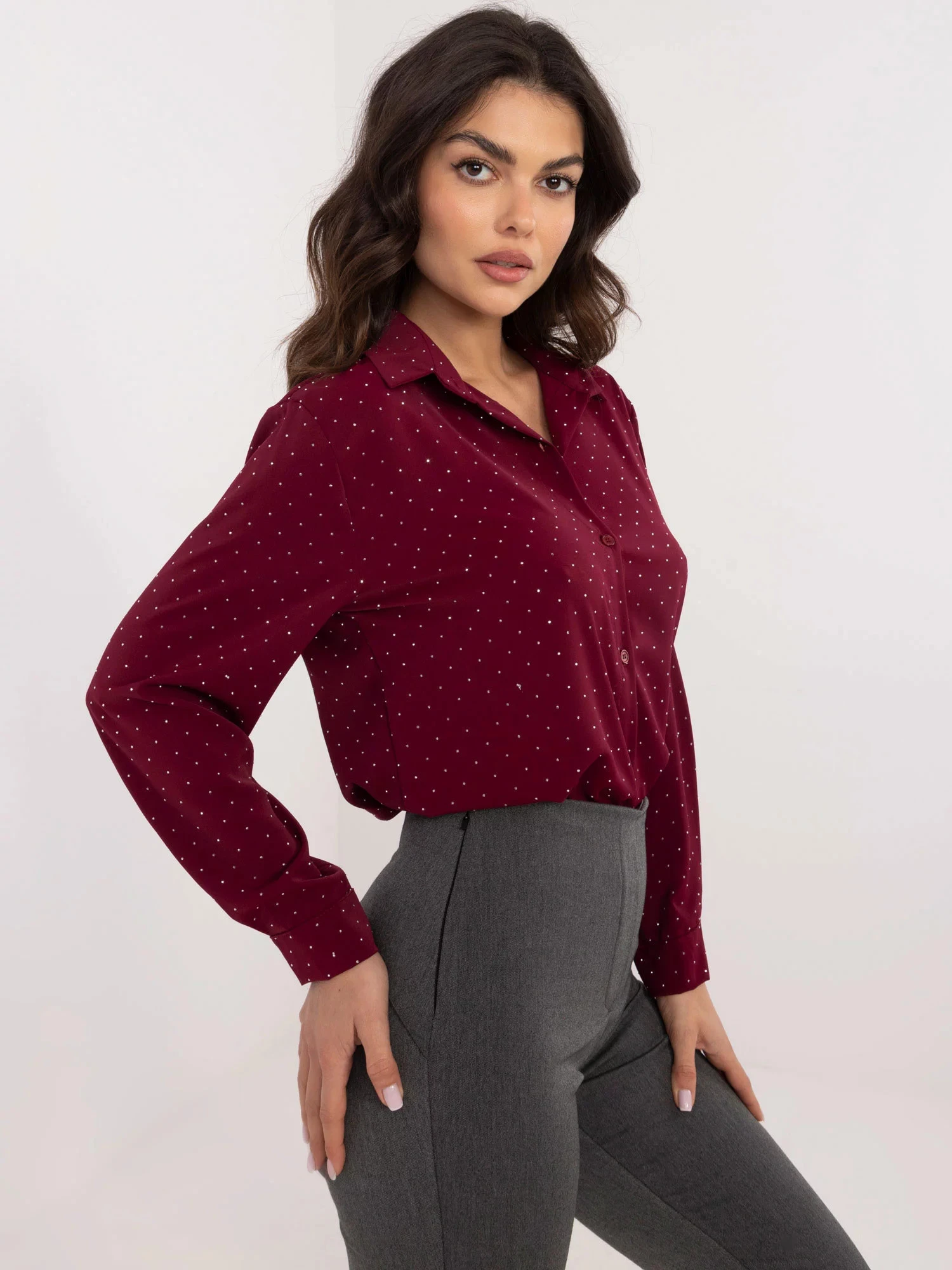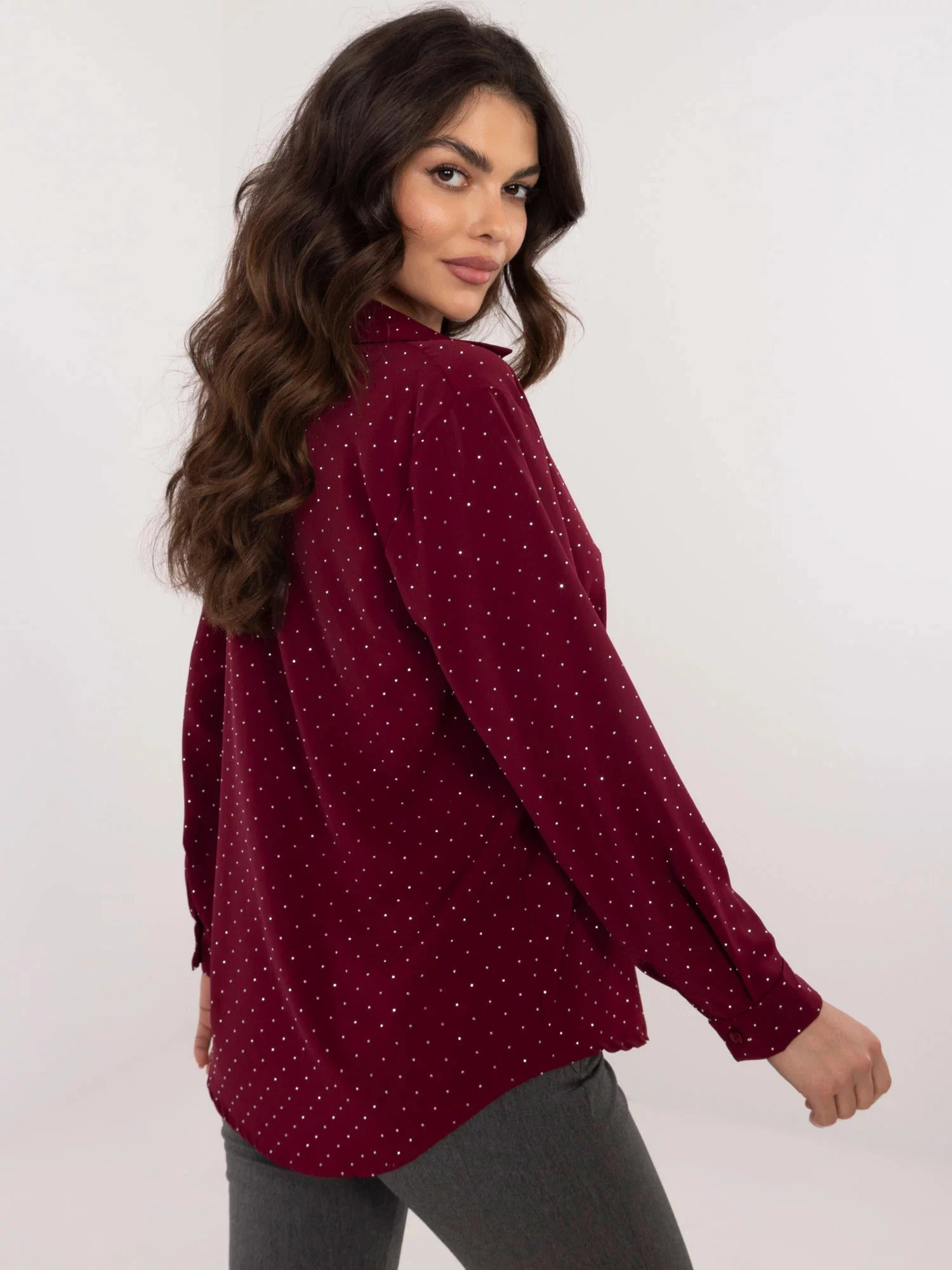 Dámská košile na knoflíky, s dlouhým rukávem, pošitá stříbrnými kamínky.