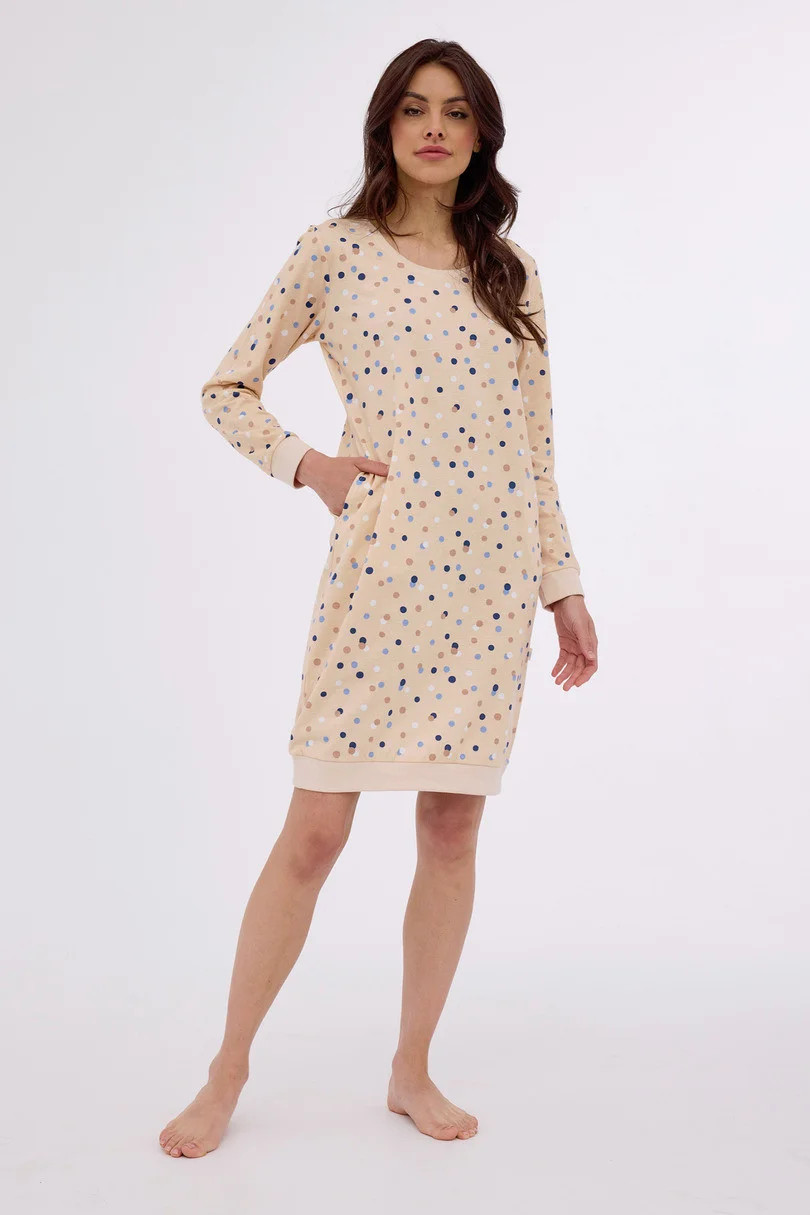 Dámské tričko z jemné bavlny s puntíkovaným vzorem, žebrovaný spodní lem, kulatý výstřih, kapsy na bocích, balené v krabici.
