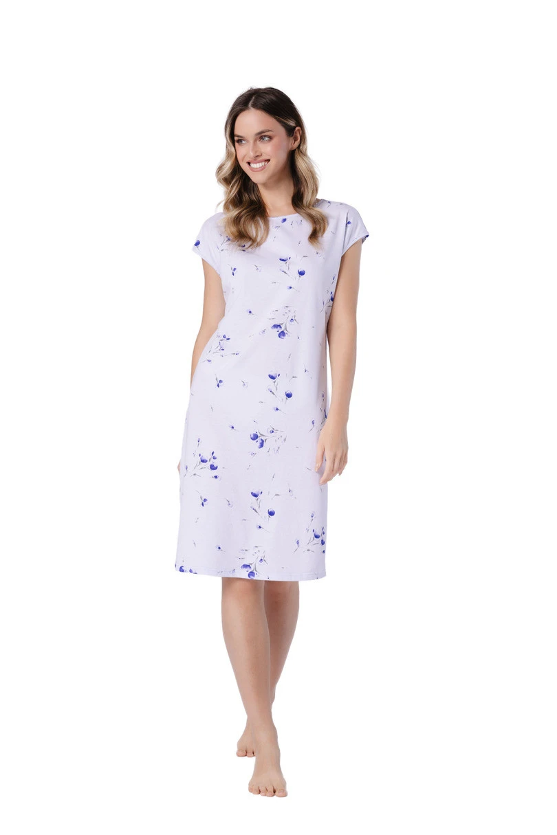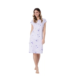 Koszula damska Karina 1736 marki Leveza to połączenie wygody, kobiecego stylu i naturalnych materiałów. Wykonana w 100% z wysokiej jakości bawełny, jest miękka, przewiewna i przyjazna dla skóry, zapewniając komfort noszenia przez całą noc. Model z krótkim rękawem i dekoltem w lekką łódkę prezentuje się subtelnie i elegancko. Kwiatowy wzór w modnym odcieniu atramentowego błękitu nadaje koszuli świeżego, kobiecego charakteru. Długość do kolan oraz praktyczny, długi rozporek po boku zwiększają swobodę ruchów i wygodę użytkowania. To idealna koszula nocna na sezon wiosna–lato, sprawdzająca się także jako komfortowa odzież domowa.