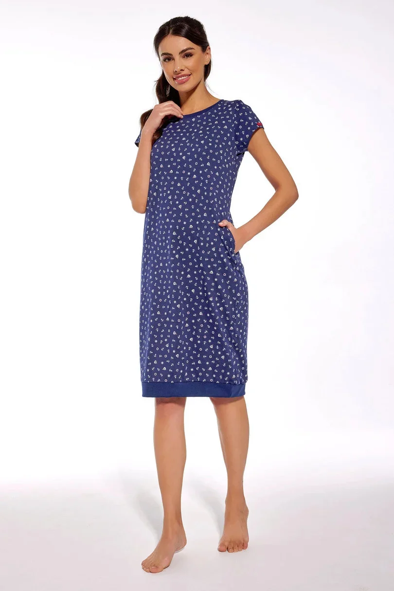 Dámská košile s krátkým rukávem, ušitá z měkké vzorované bavlny. Spodní část košile je lemována jemným žebrovaným lemem. Baleno v krabici.
