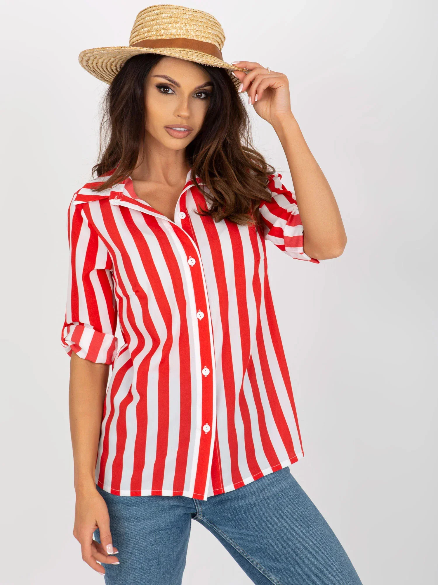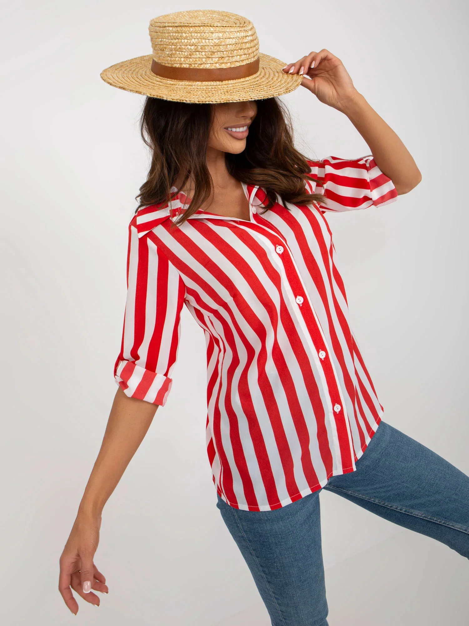 Červenobílá pruhovaná košilová halenka .