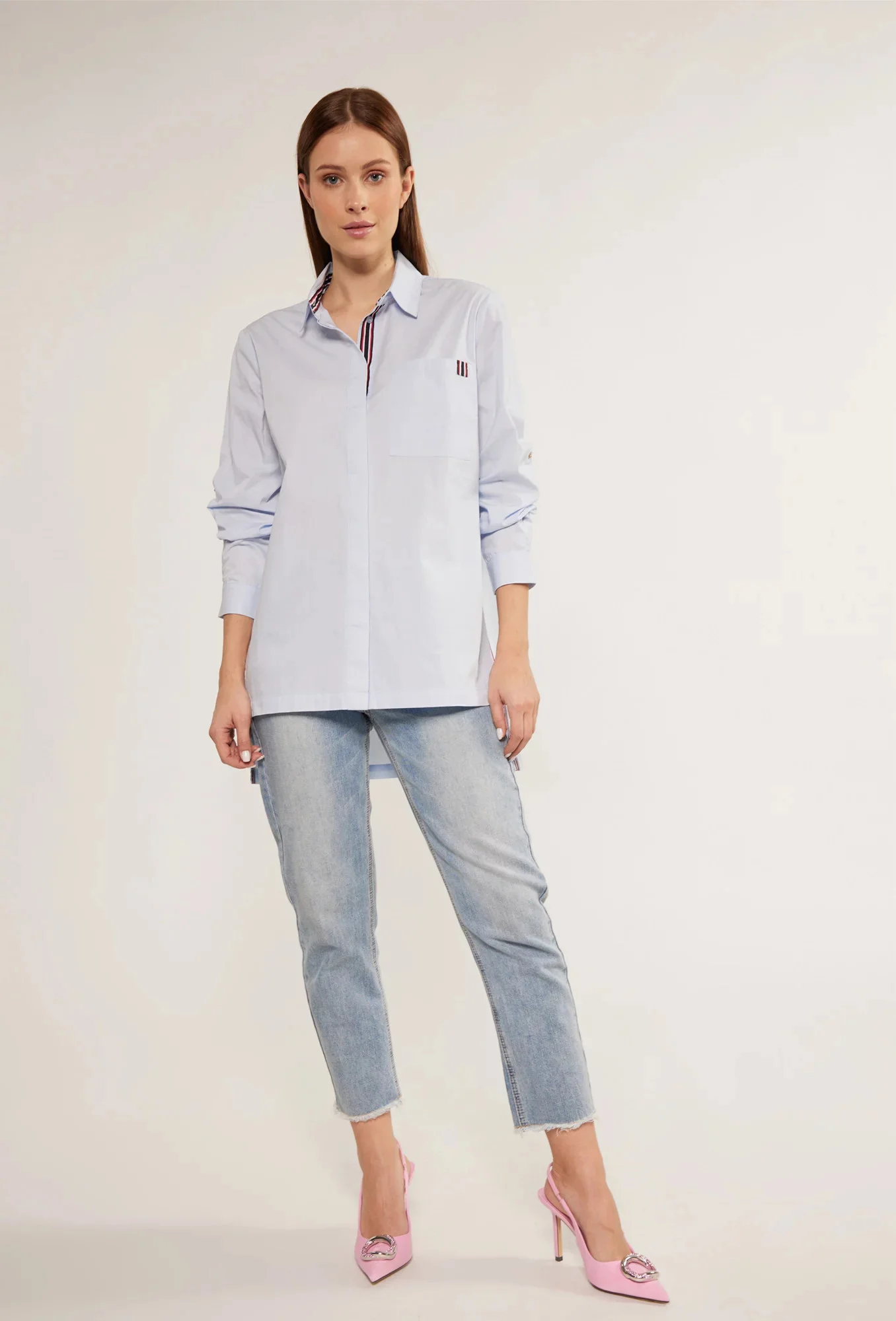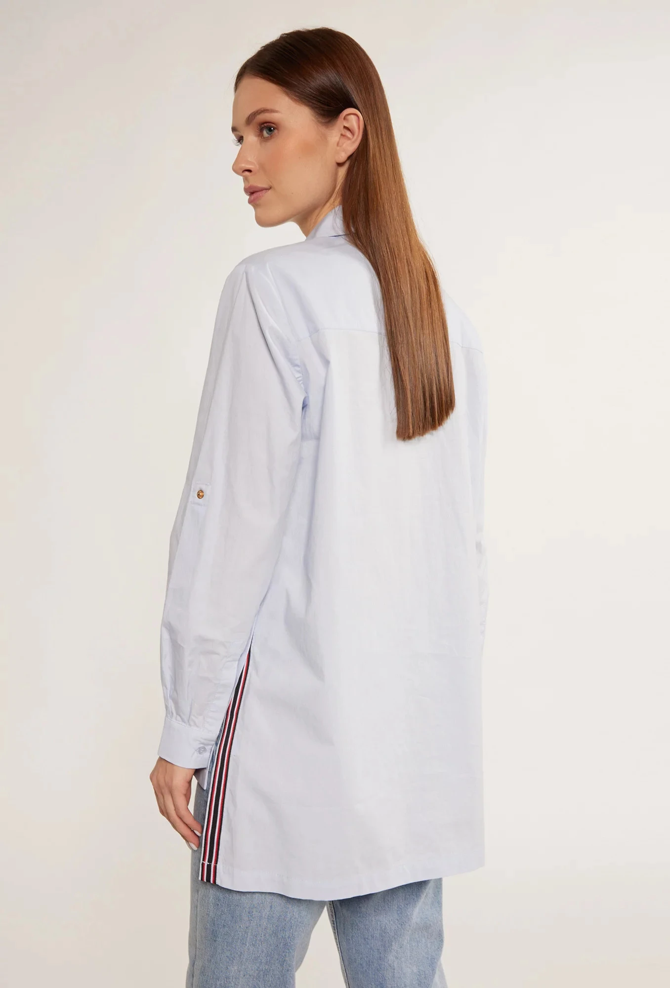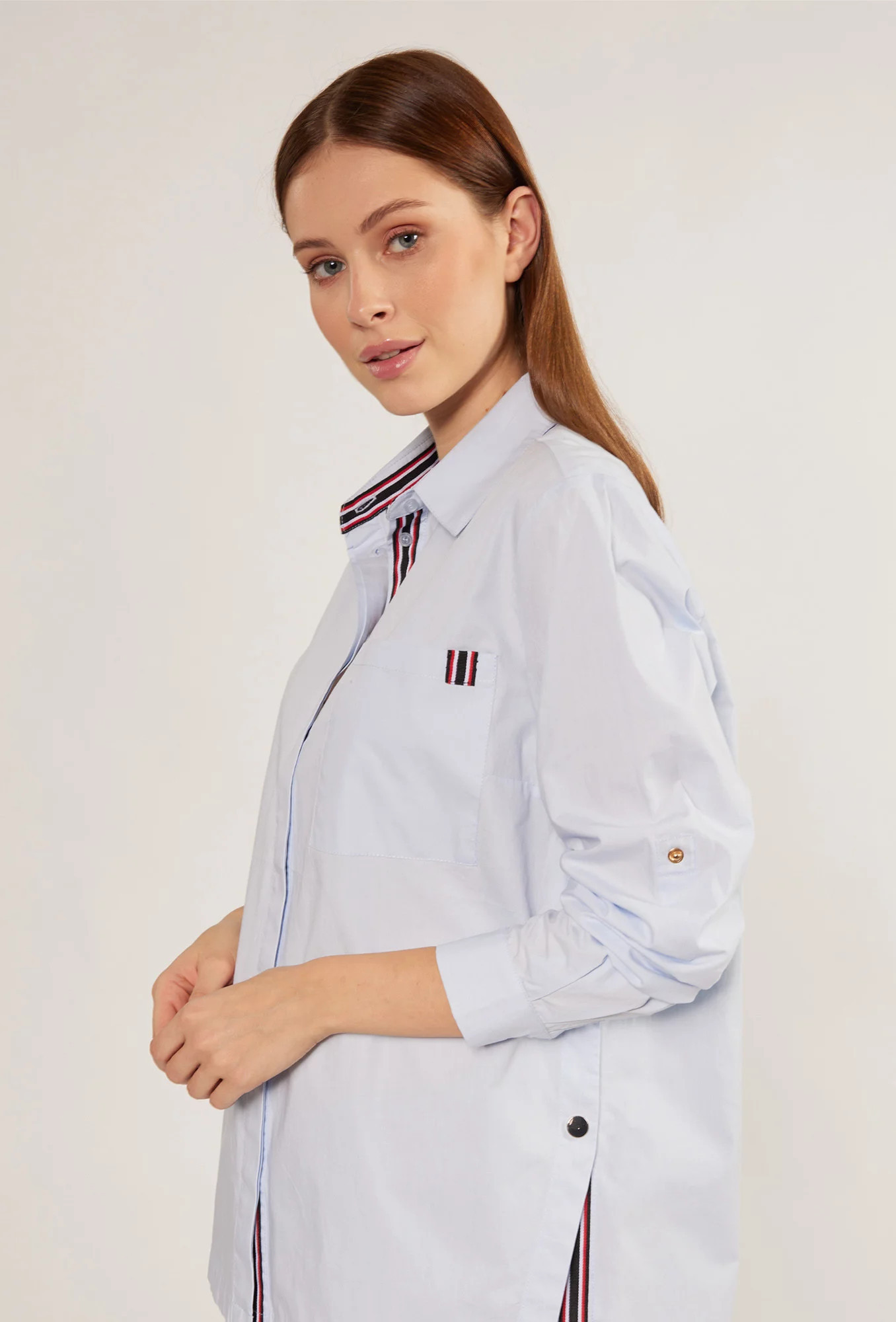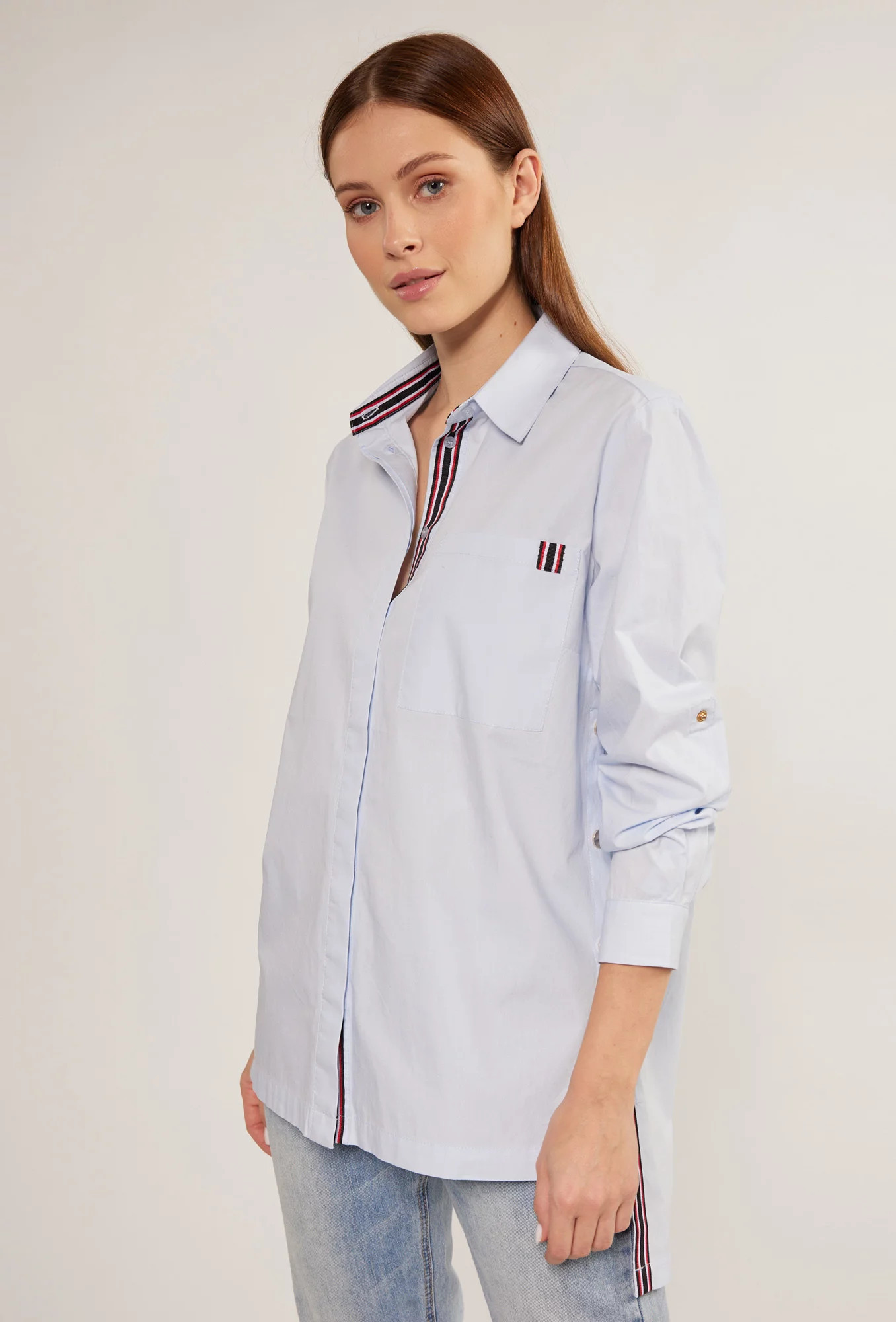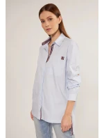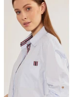 Bavlněné dámské tričko s ozdobnými vsadkami v podobě pruhů. Košile s dlouhými ohrnutými rukávy a rozparky na bocích. Košile s prodlouženým zadním dílem, zapínaná na knoflíky s klasickým límcem. Na linii poprsí je našitá kapsa. Tento model je ideální pro každodenní použití i pro zvláštní příležitosti.