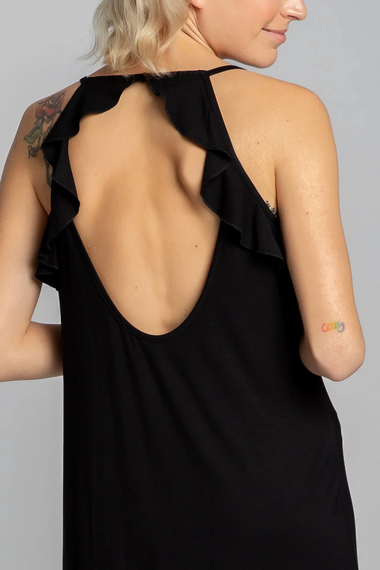 Nařasená košilka, je ušita z měkké, pružné viskózové tkaniny a má design se špagetovými ramínky zdobený nařasením, vykrojená záda a výšivku vlka na hrudi.
