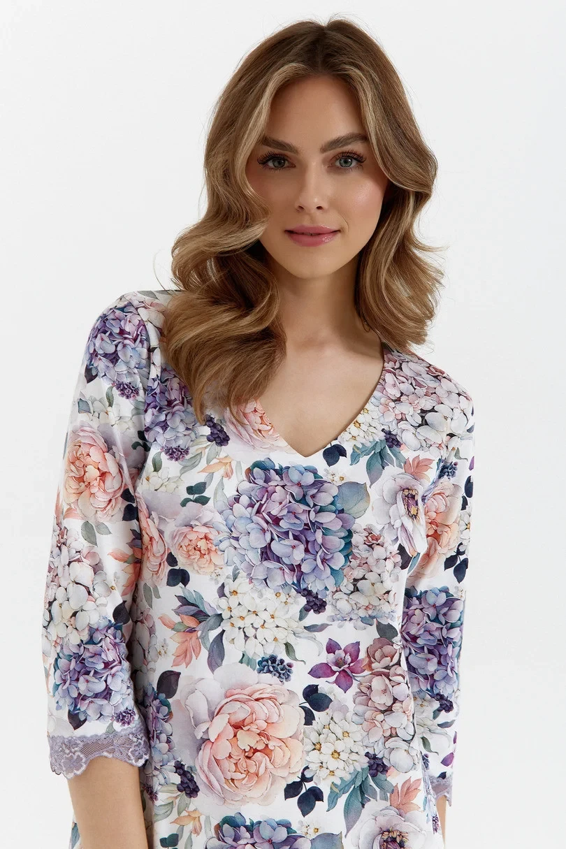 Rękaw 3/4 ozdobiony miękką, liliową koronką dodaje subtelności i lekkości całej stylizacji. Trójkątny, odszywany dekolt delikatnie eksponuje szyję, a długość do kolan sprawia, że koszula jest idealna zarówno na co dzień, jak i na wyjątkowe okazje. Poczuj się stylowo i wygodnie w każdej sytuacji!