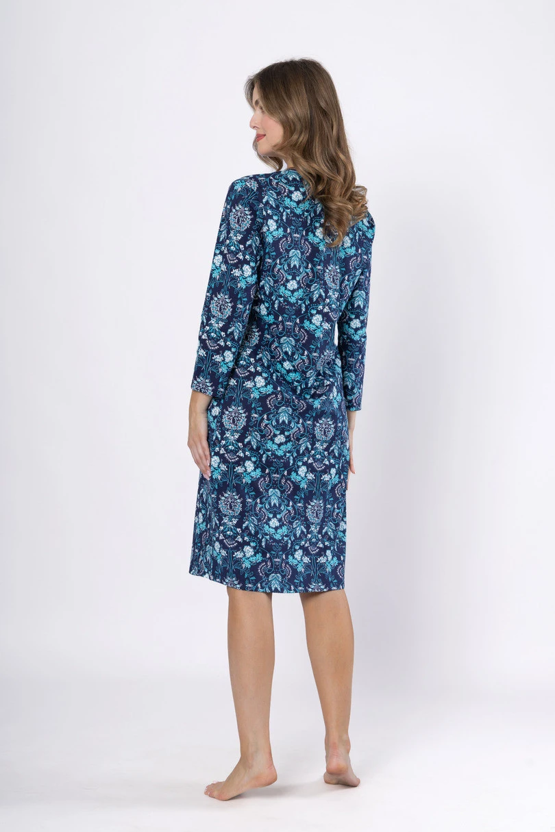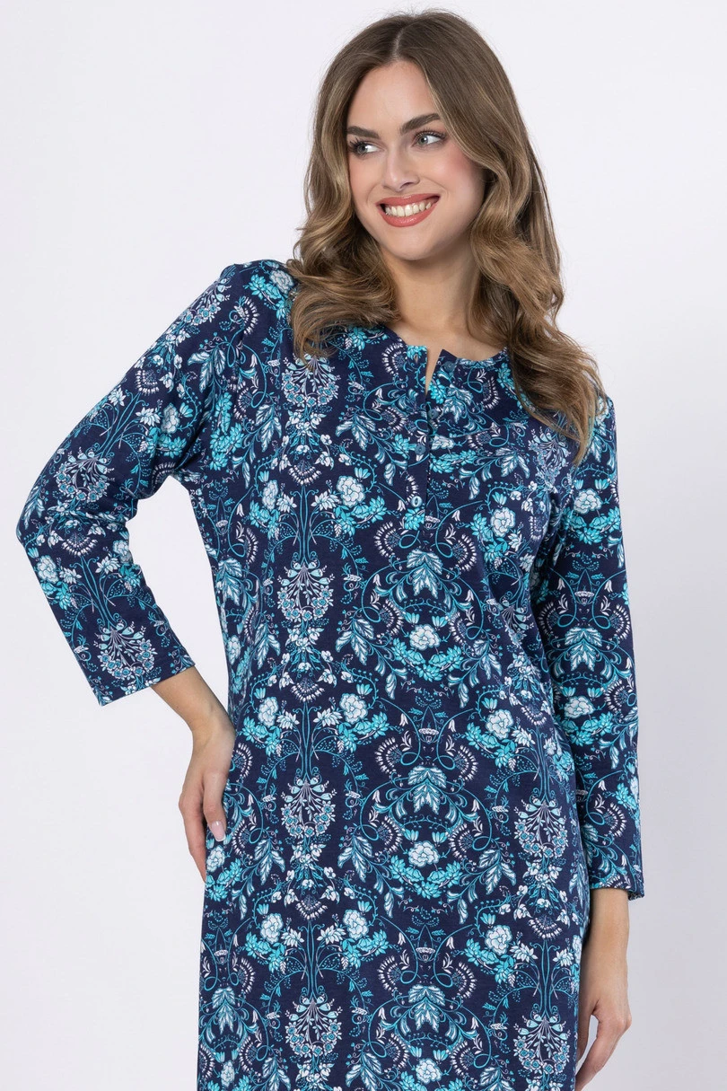 Dámská košile ARLETA 1653 značky LEVEZA je elegantní a pohodlnou volbou pro spánek i domácí relaxaci. je vyrobena ze 100% měkké, prodyšné bavlny a poskytuje naprosté pohodlí. tmavě modrou látku zdobí jemný květinový vzor, zatímco rubová strana s kontrastními knoflíky dodává sofistikovaný nádech. model s délkou ke kolenům a 7/8 rukávy kombinuje klasický lem s ženským šarmem. je k dispozici ve velikostech M–2XL a bude ideální volbou pro každé roční období.