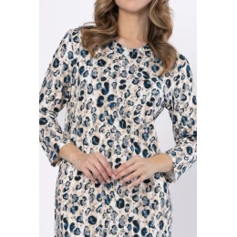 Koszula damska WITALIA 1665 marki Leveza to propozycja klasy premium, stworzona z myślą o kobietach, które cenią elegancję, wygodę i najwyższą jakość. Wykonana w 100% z uszlachetnionej bawełny, zapewnia wyjątkową miękkość, trwałość i komfort noszenia przez cały dzień lub noc. Model posiada okrągły dekolt oraz modną długość 7/8, która subtelnie podkreśla sylwetkę i dodaje lekkości. Wzór w zwierzęcy motyw panterki w tonacji beżu i granatu nadaje koszuli wyrafinowanego, nowoczesnego charakteru. Długość sięgająca do kolan sprawia, że to idealna koszula nocna lub stylowa odEAN čárové kódy zboží jsou: