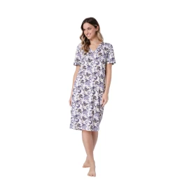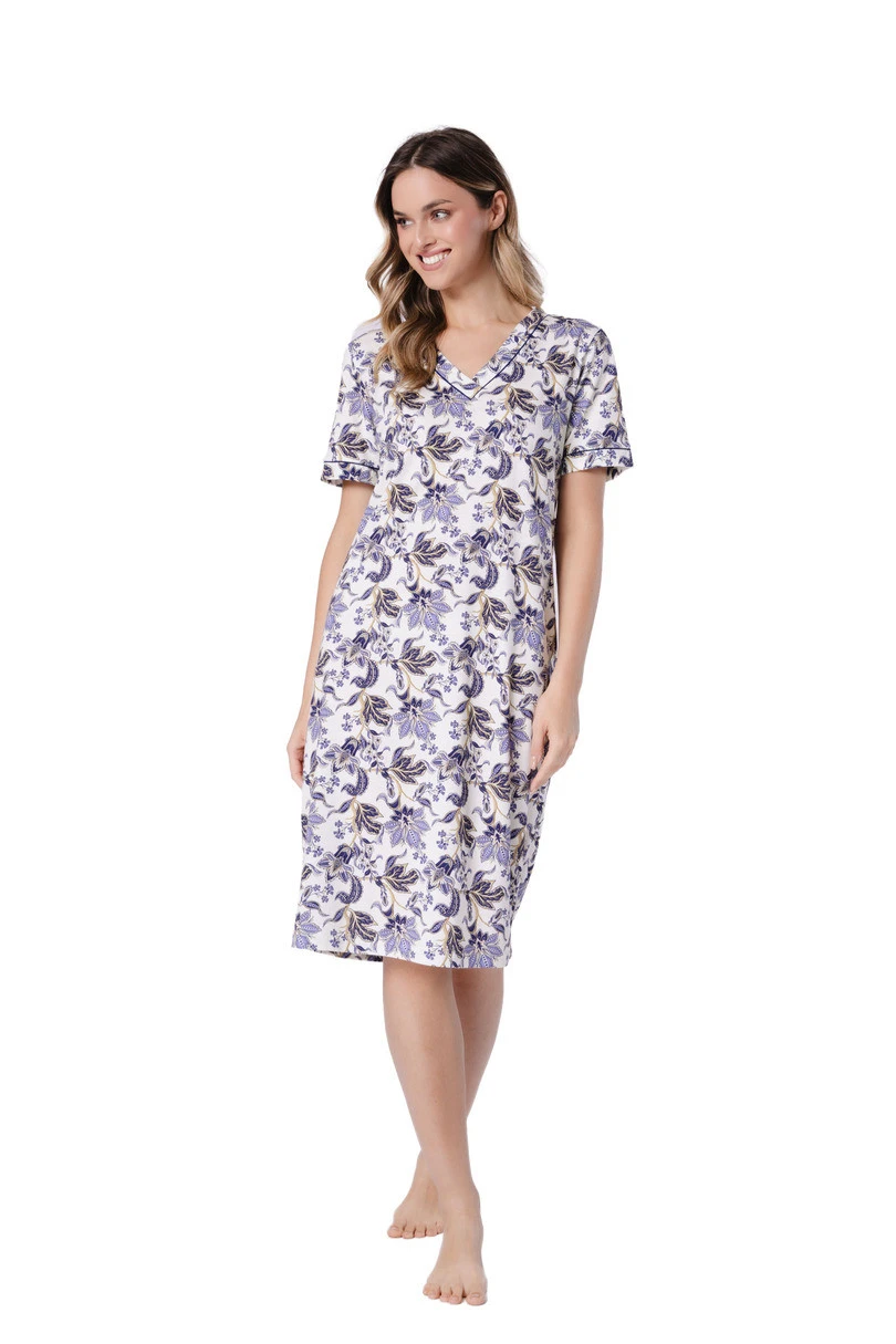 Koszula damska Ilona 1739 marki Leveza to elegancka i wygodna propozycja dla kobiet ceniących klasyczny styl oraz najwyższy komfort noszenia. Wykonana w 100% z uszlachetnionej bawełny, jest wyjątkowo miękka, gładka i przyjemna dla skóry, a jednocześnie zapewnia doskonałą oddychalność. Model z dekoltem w serek subtelnie podkreśla kobiecą sylwetkę, a krótki rękaw wykończony mankietem nadaje koszuli eleganckiego charakteru. Kontrastowe wypusty w połączeniu z kwiatowym wzorem w kolorystyce ecru i granatu tworzą ponadczasową, stylową całość. Długość za kolano sprawia, że koszula doskonale sprawdzi się zarówno jako koszula nocna, jak i komfortowa odzież domowa.